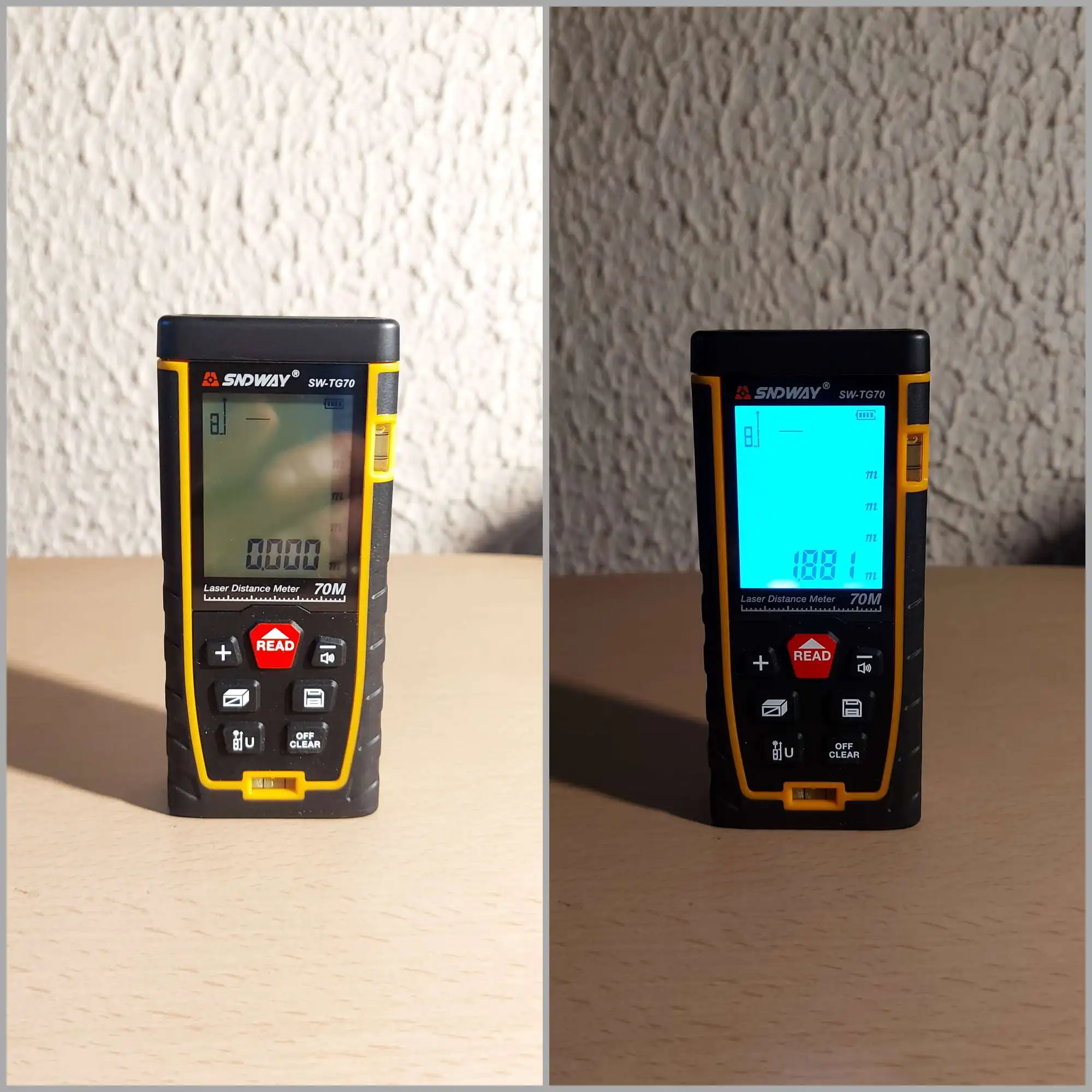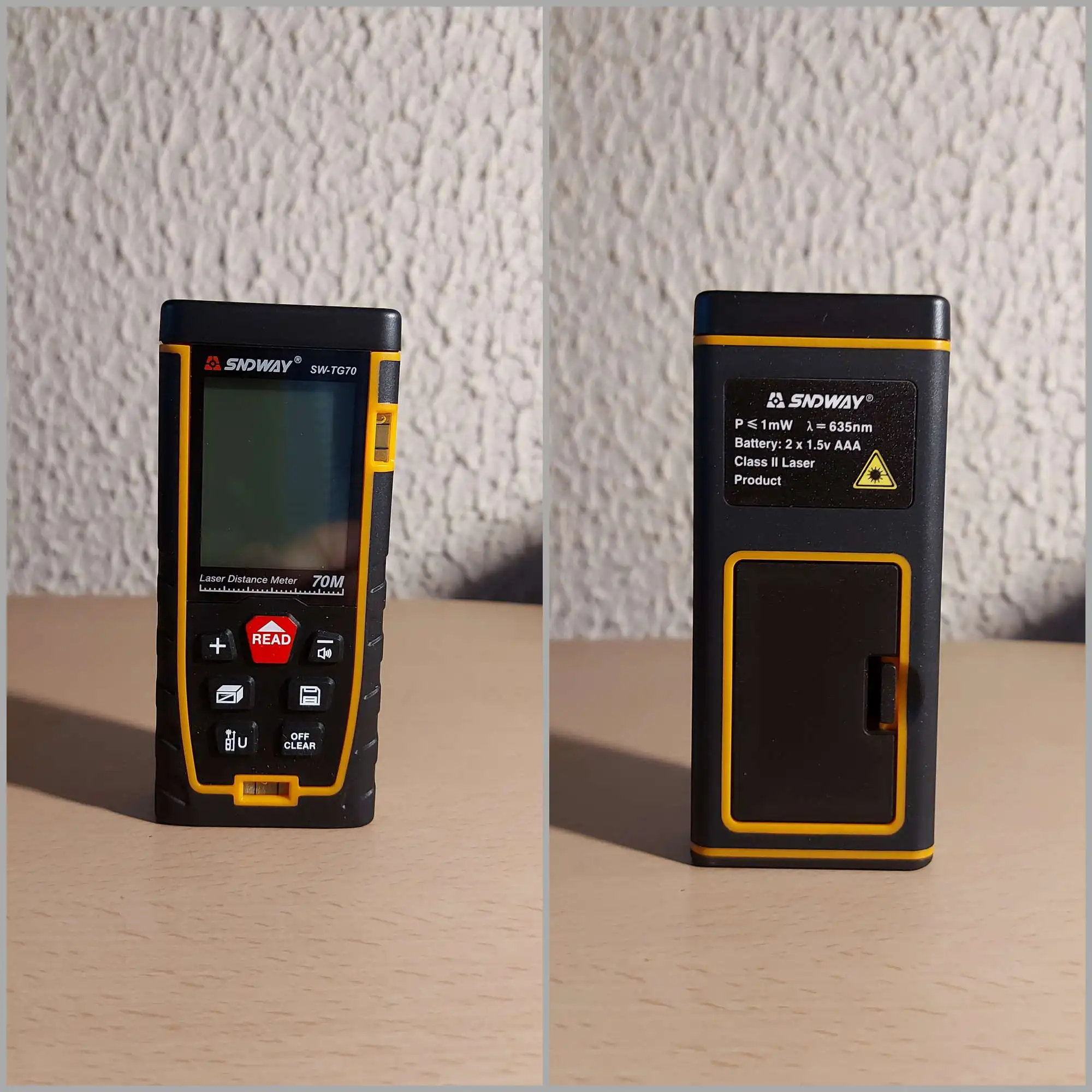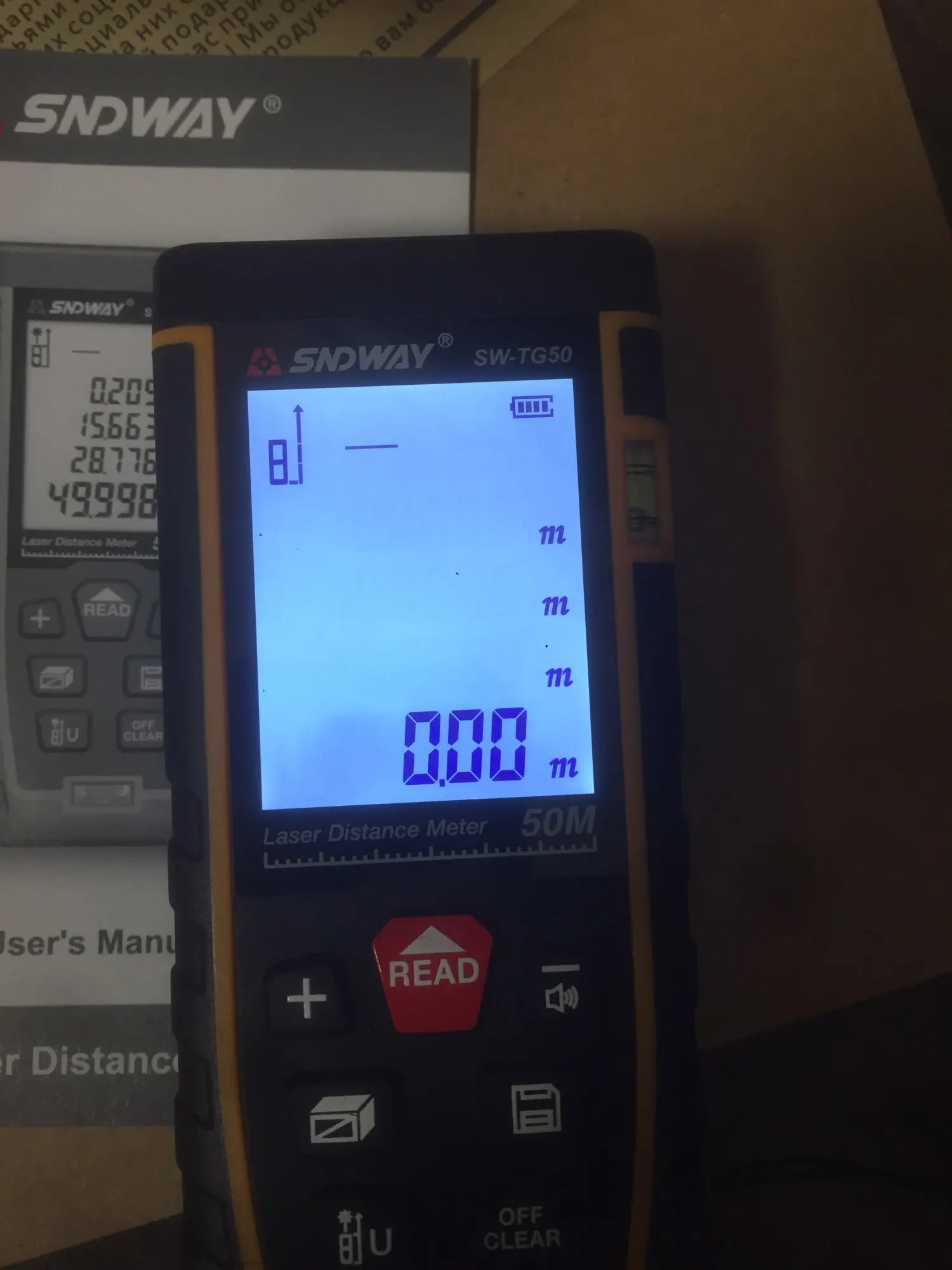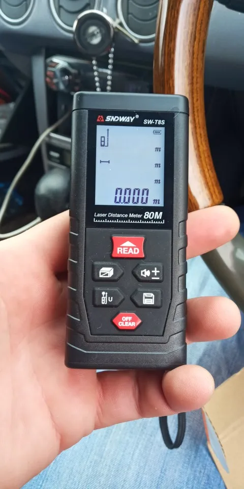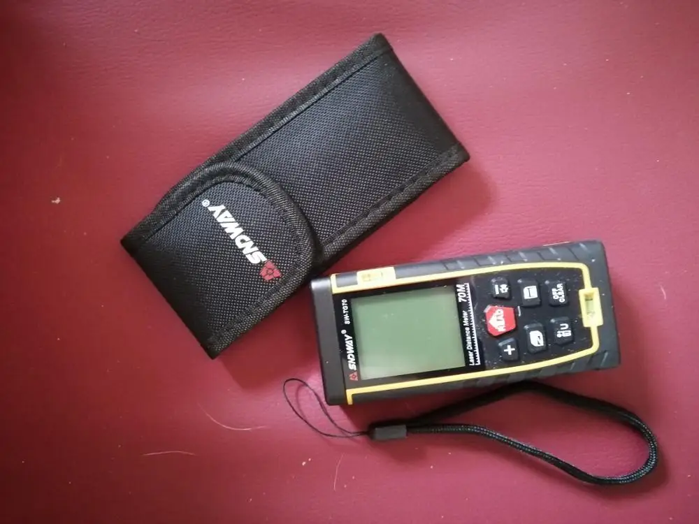 Посылка пришла быстро, за неделю. Доставили на адрес. Брал вариант до 70 метров. Батареек в комплекте не было. Пробовал максимальную дальность измерения. С трудом но удалось снять измерение 70 метров. Более-менее стабильно удается измерять до 60 метров. Все, что дальше-слишком много ошибок сигнала. При этом большое значение имеет значение материал, от которого отражается сигнал. Часть функций включаются не очевидно: смена единиц измерения и знаков после запятой - при удержании нижней левой кнопки; измерение минимального и максимального расстояния-при удержании кнопки снятия измерений.