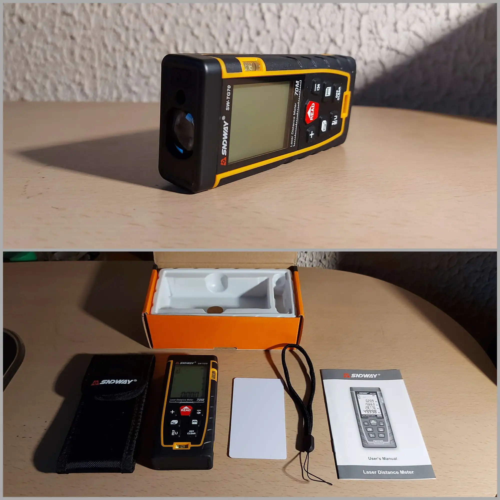 Спасибо. Заказ прибыл очень быстро. Красиво и качественно упакован. Имеется инструкция, ремешок для фиксации на руке, чехол для хранения и переноски имеет поясное крепление. Пока проверил на дистанции 60 метров, промерено.