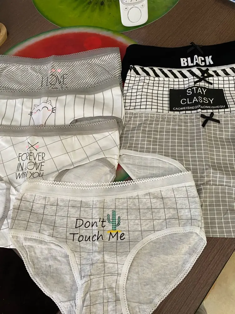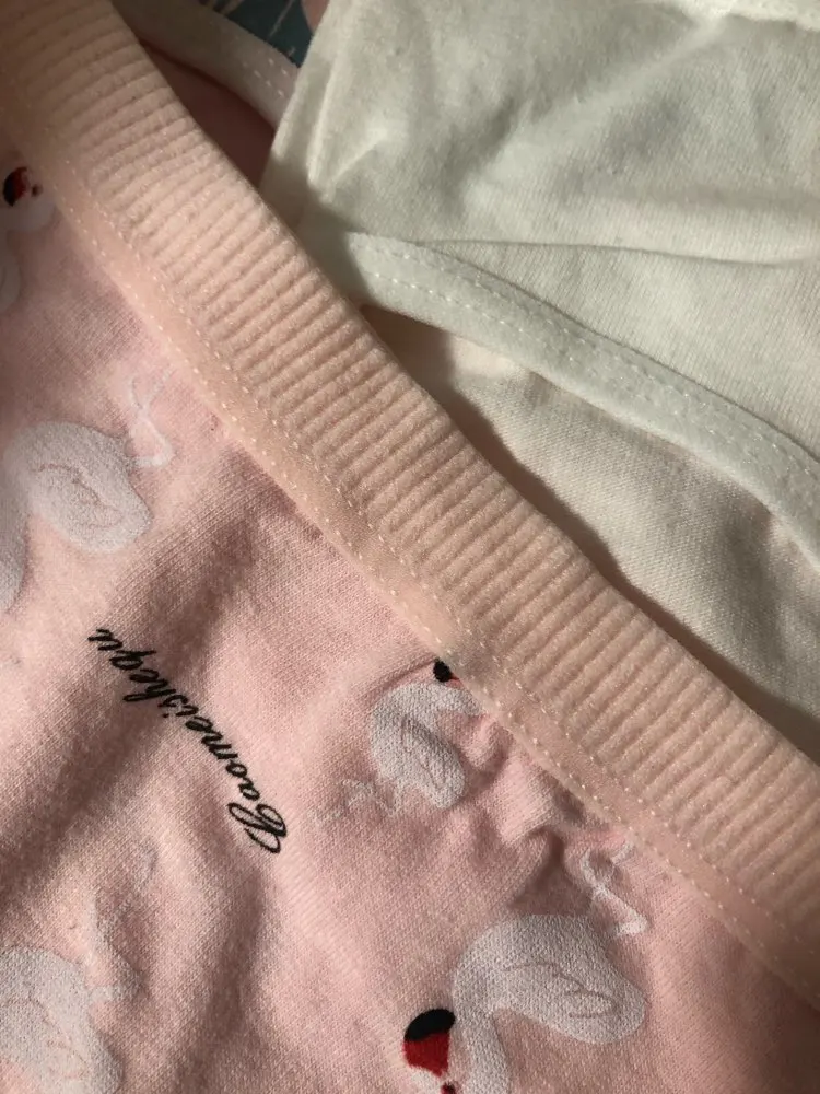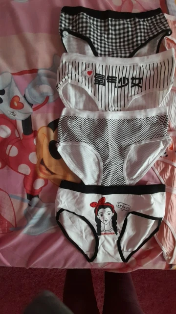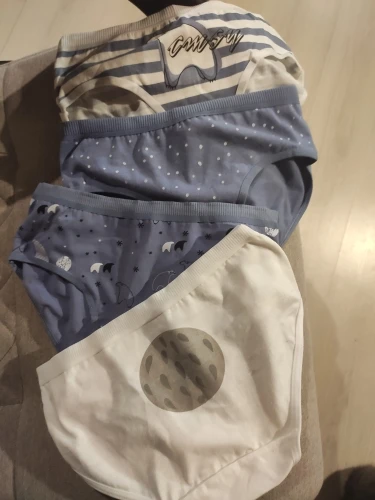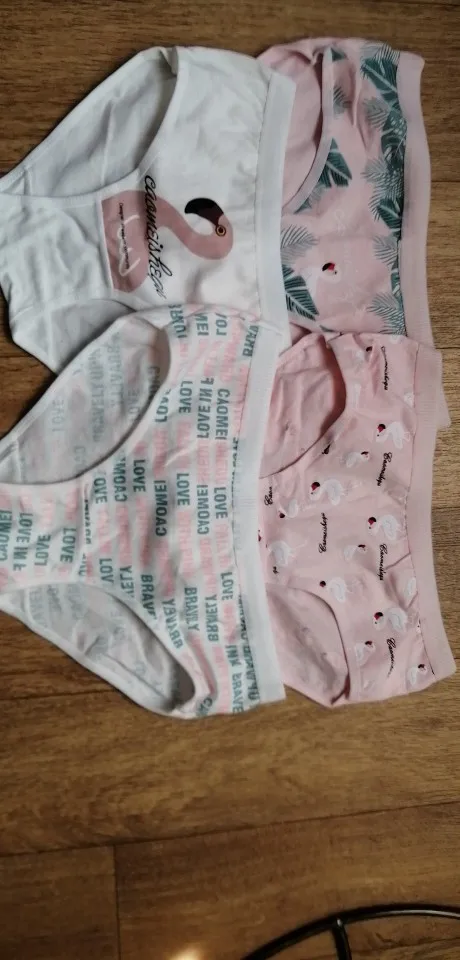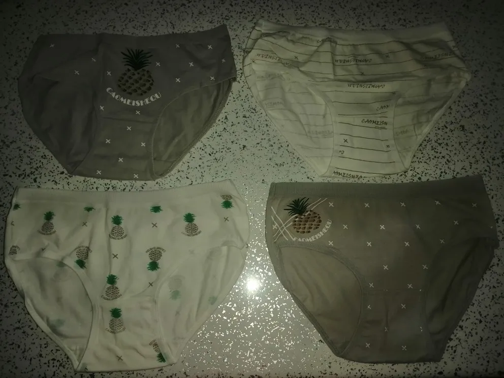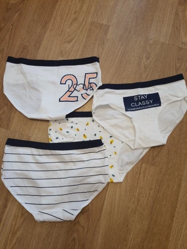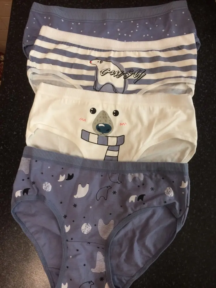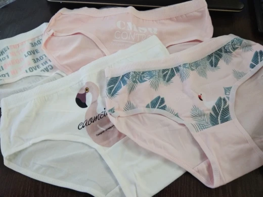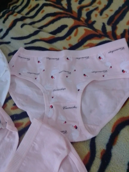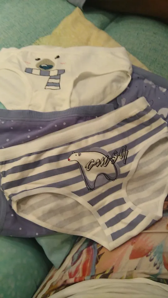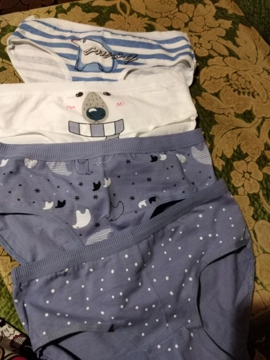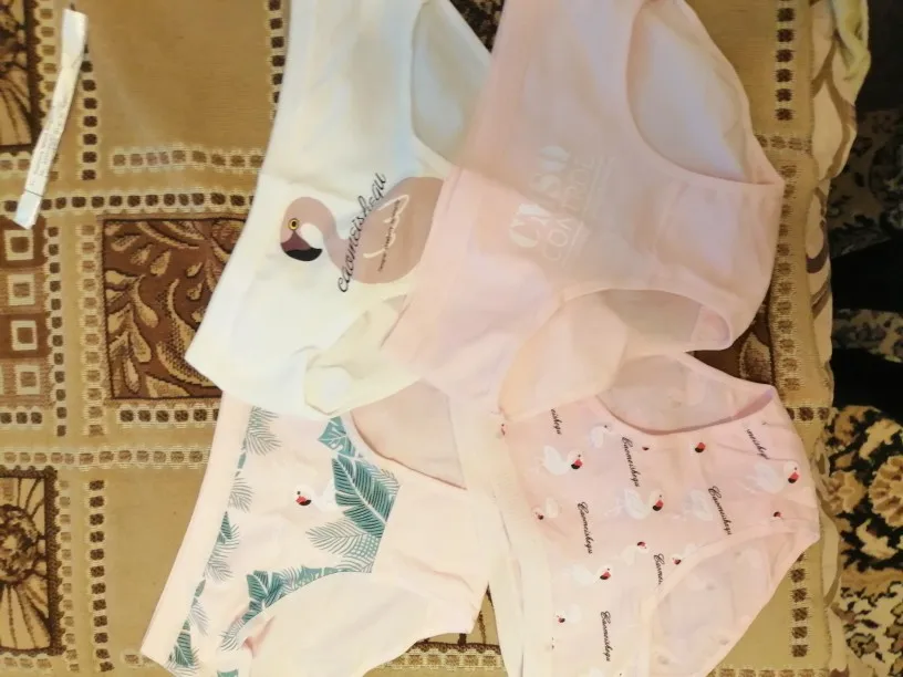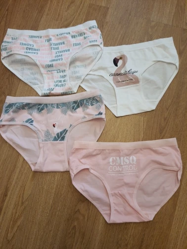 Беру уже 3-й набор трусиков у этого продавца. Дочь носит с удовольствием и отказывается одевать трусики других моделей, которые были у нас до этих трусиков. У нас уже есть розовый комплект с фламинго и чёрно-серые. Теперь белые взяли. Они хлопковые, немного тянутся. На худенькую девочку 11-ти лет беру размер 13. Доставка месяц.