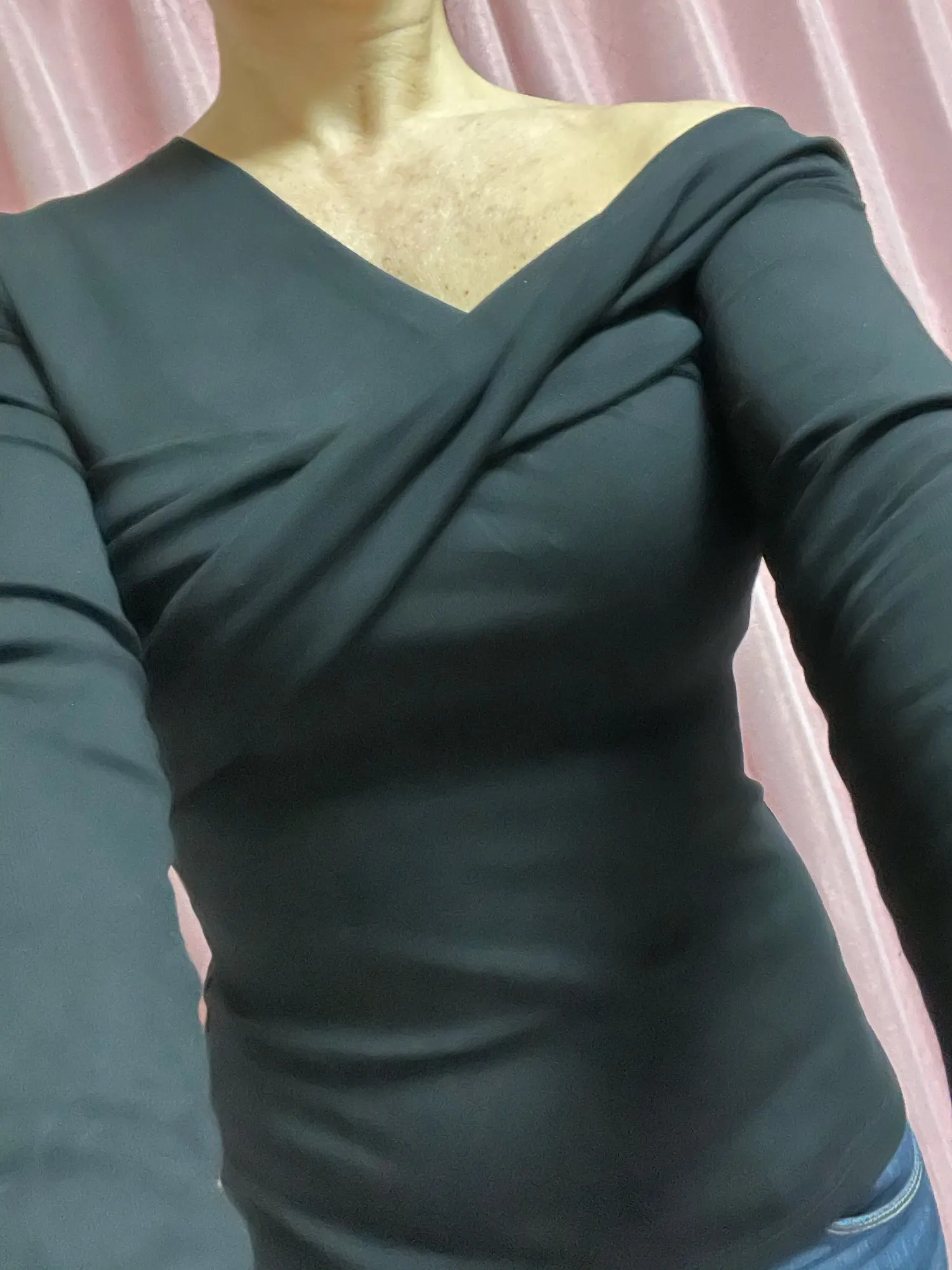 Плотный хлопковый трикотаж, приятный к телу, интересная модель - очень понравилось. В размере М на мой обычный 42й размер (XS-S) длина плеча оказалось велика на 2 см, попробую уменьшить. На ОГ 88-89 см драпировка села как надо - если взять меньше, то получится внатяг и складки будут не так эффектно выглядеть