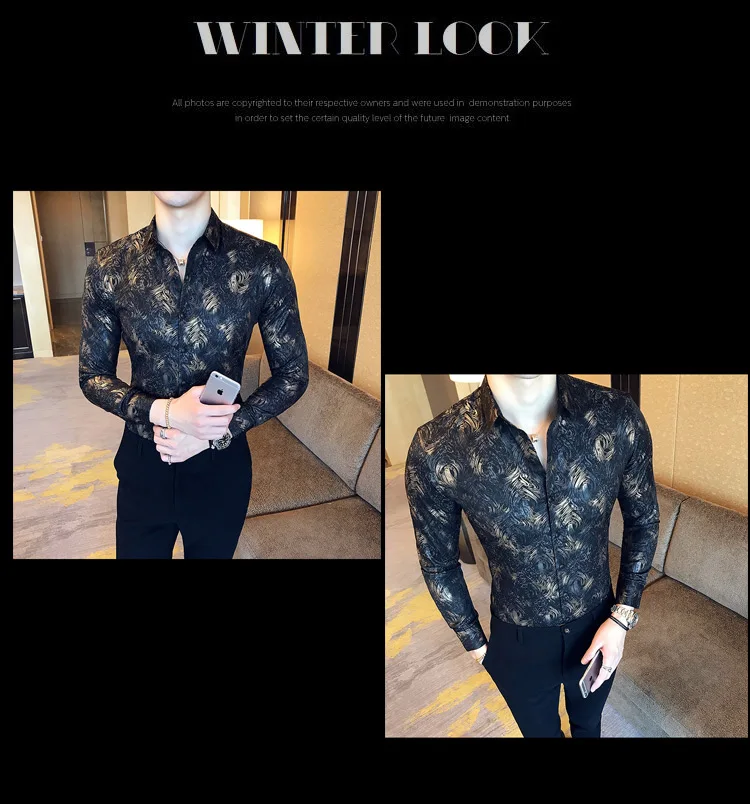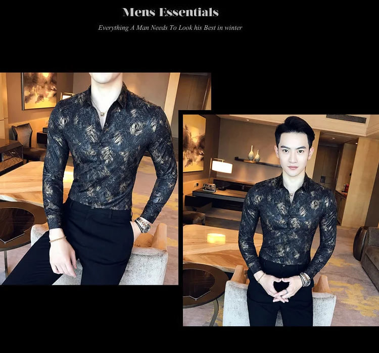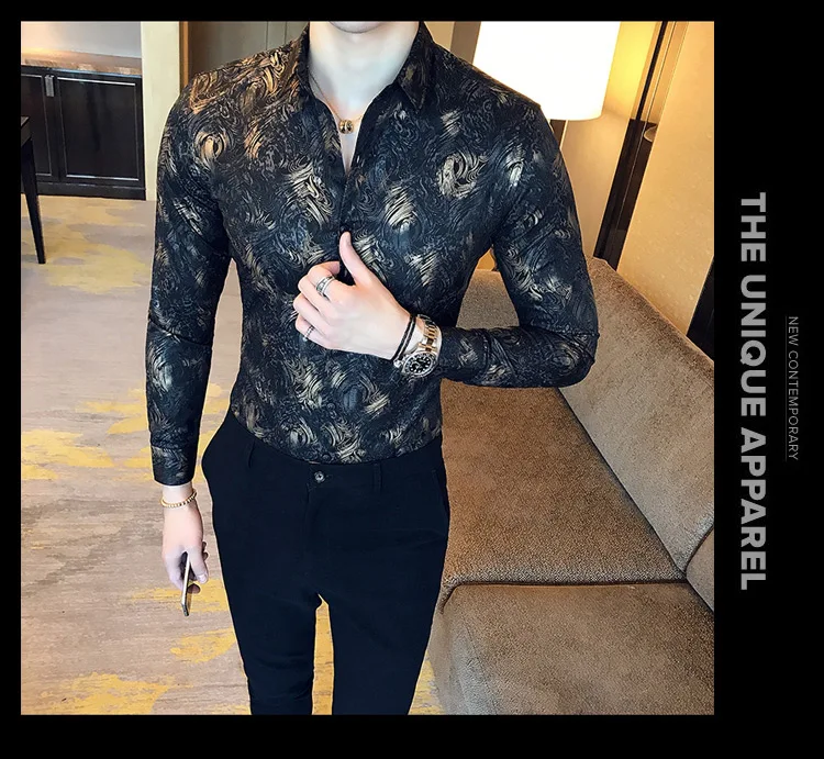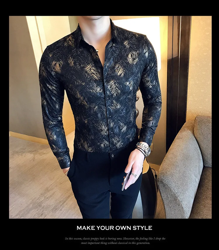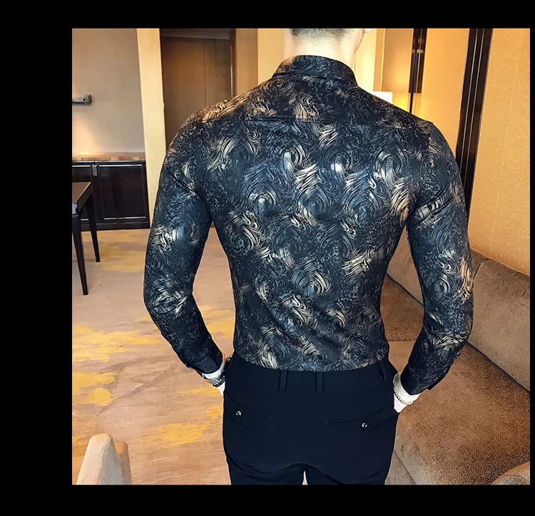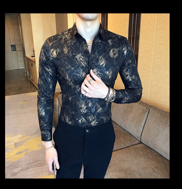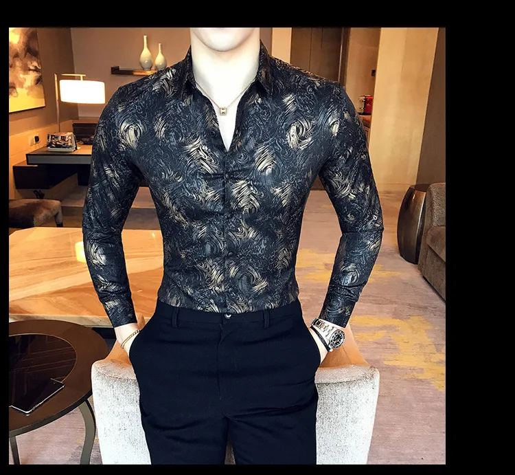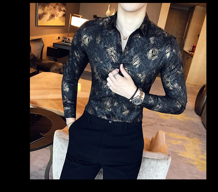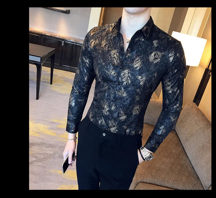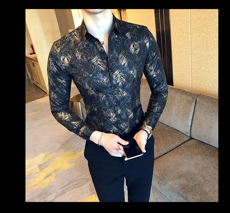Новинка Осень-зима 2019 эксклюзивная модная мужская Повседневная рубашка с длинным рукавом и золотым шелковым принтомоблегающие мужские рубашки для отдыха