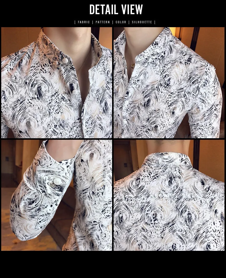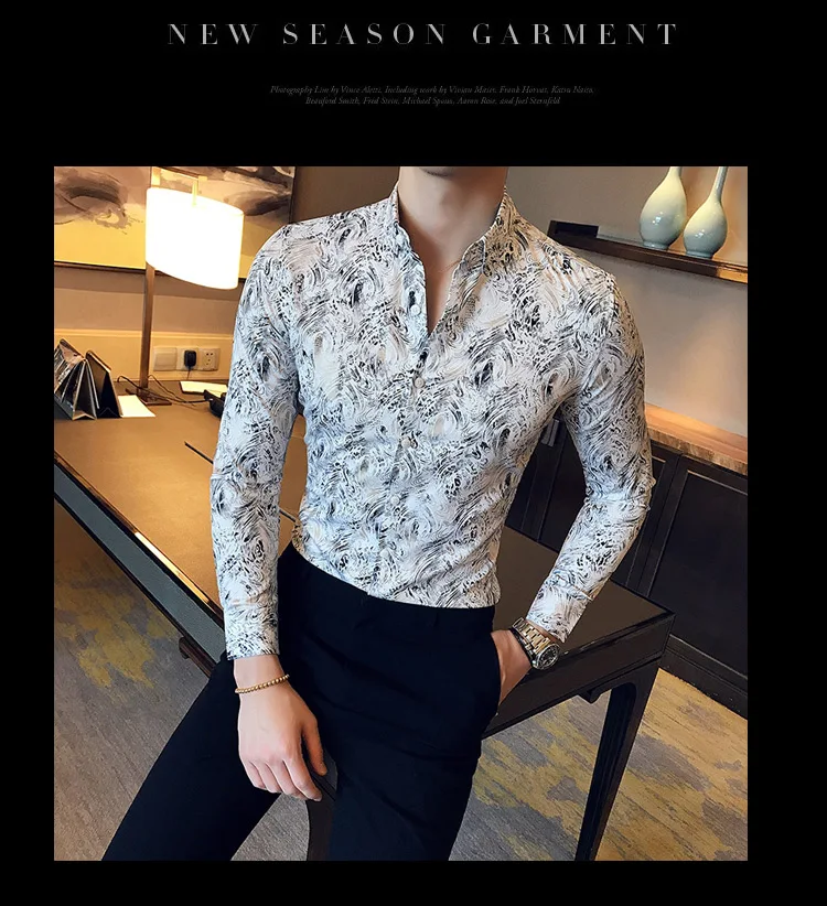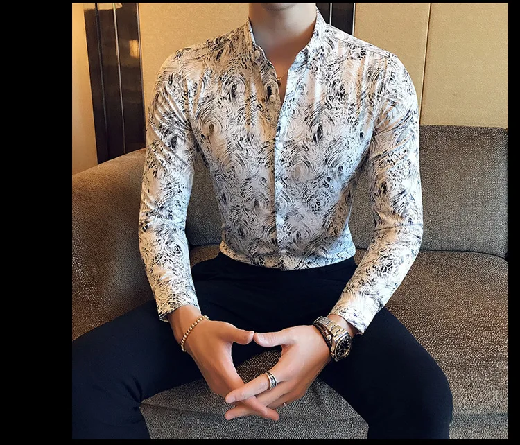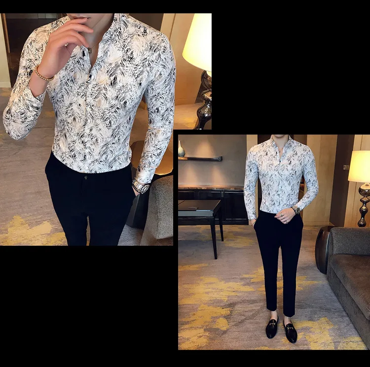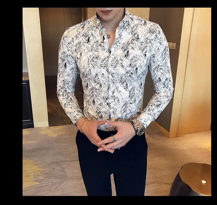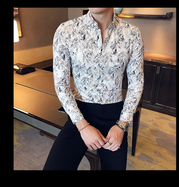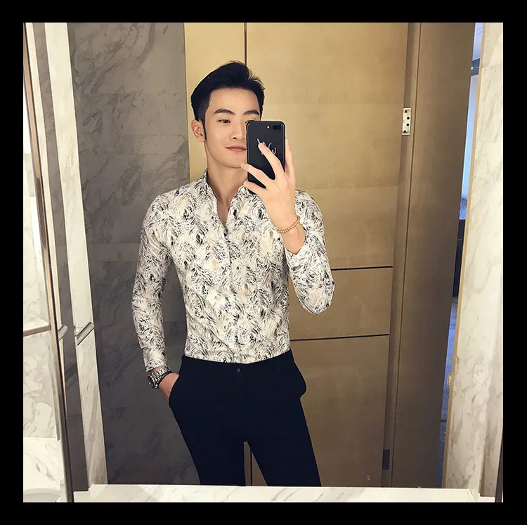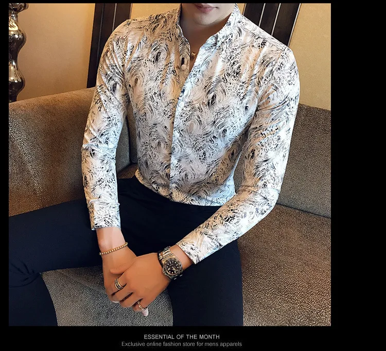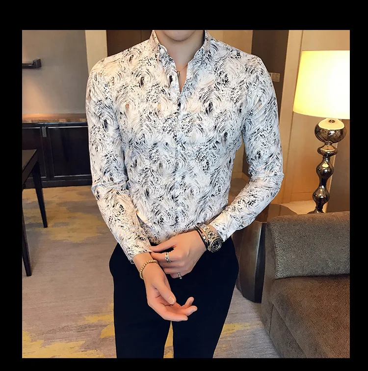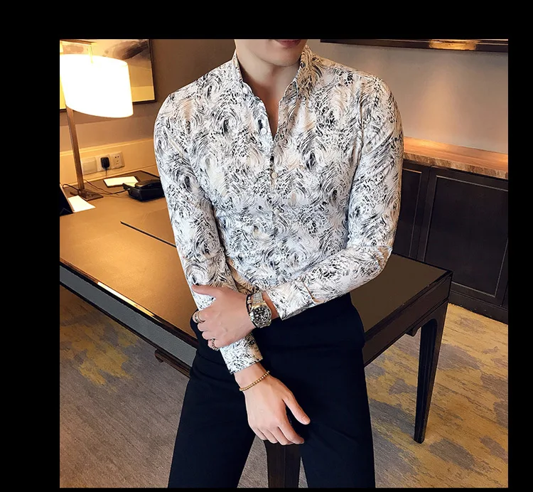 Новинка Осень-зима 2019 эксклюзивная модная мужская Повседневная рубашка с длинным рукавом и золотым шелковым принтомоблегающие мужские рубашки для отдыха