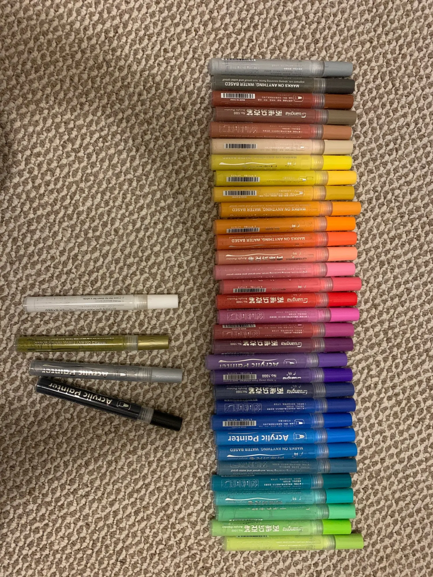 маркеры супер, пока проверила только белый и чёрный и уже в них влюбилась. укрывистость отличная, сколько прослужат пока не ясно, потом дополню отзыв. водостойкие, сохнут быстро. действительно качественный товар, но доставка 1,5 месяца