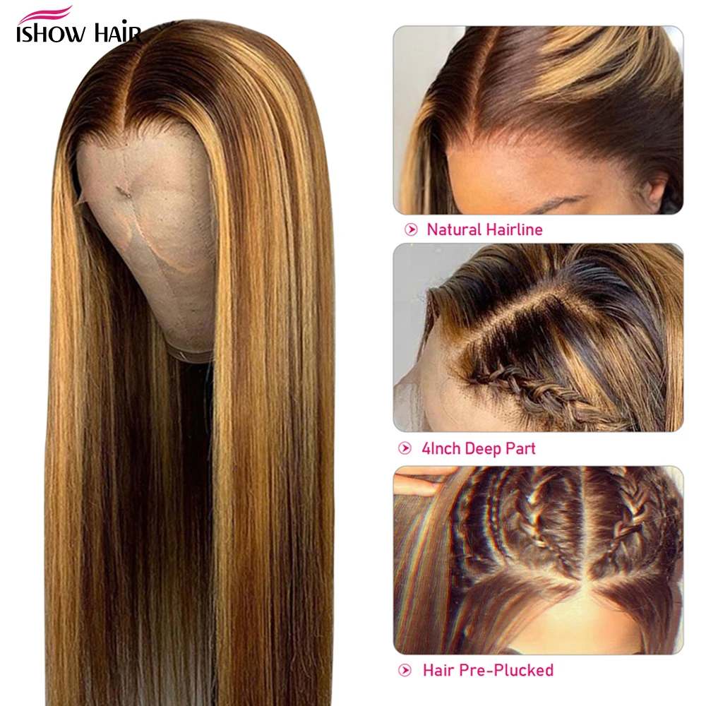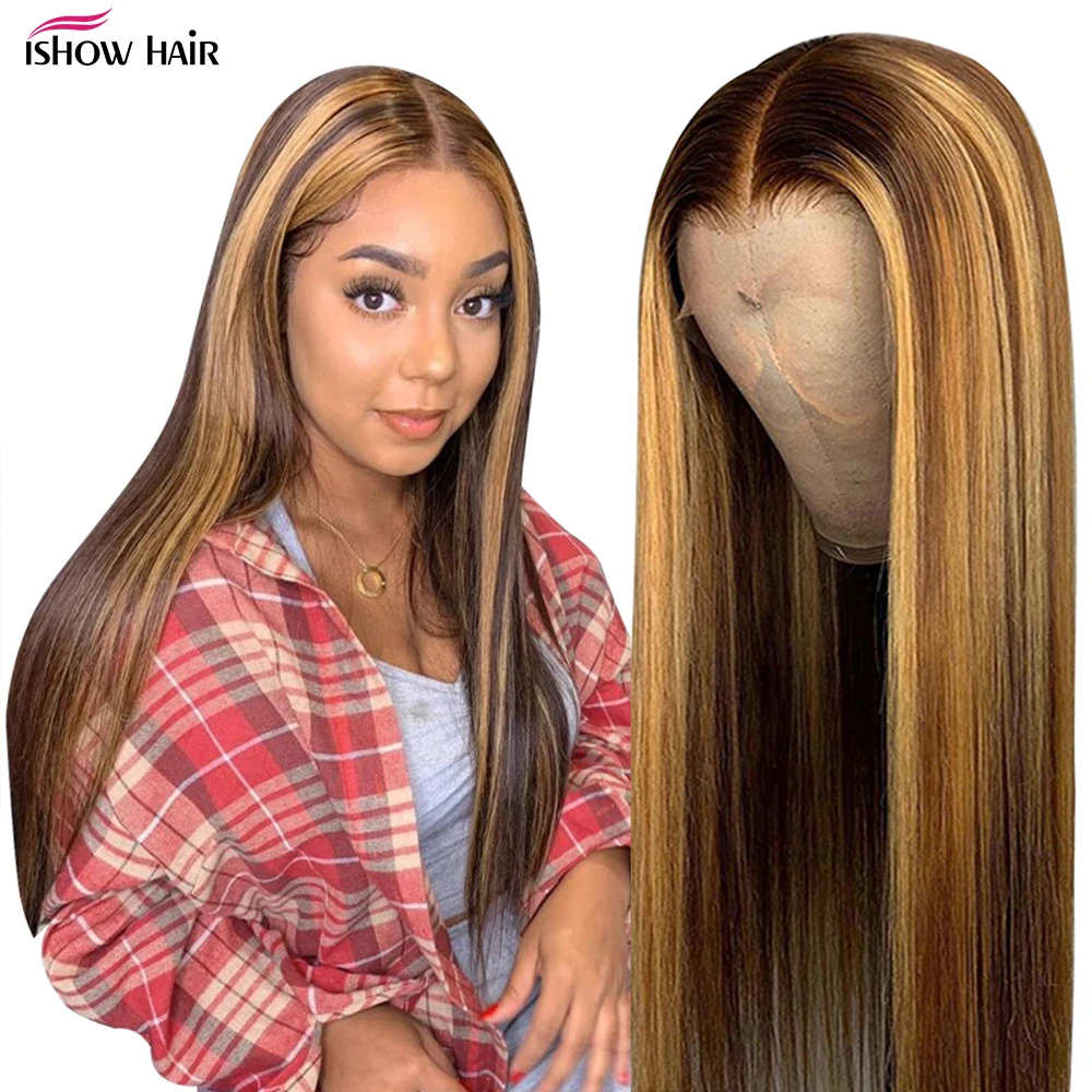 Ishow Омбре хайлайтер парик коричневый медовый блонд цветной индийский цельный кружевной передний парик из человеческих волос Прямые 13X4X1 кружевной передний парик