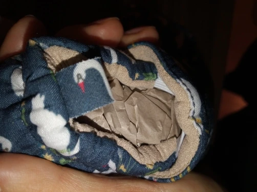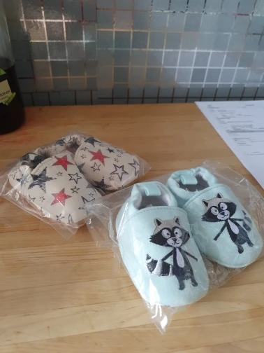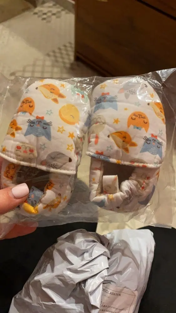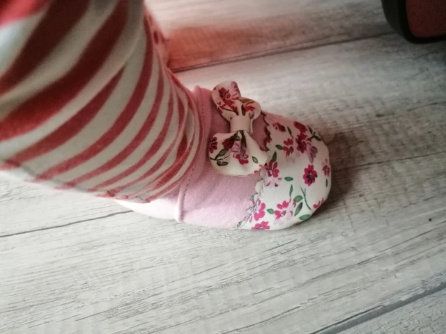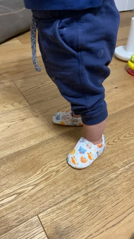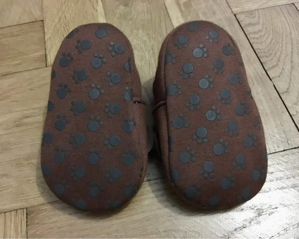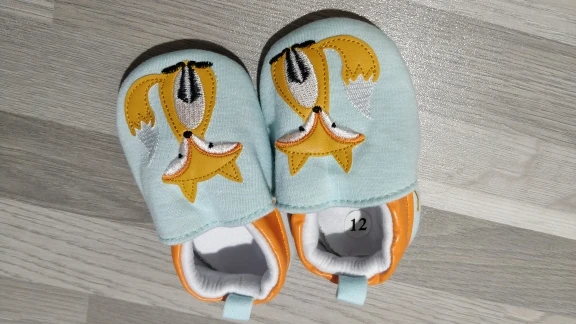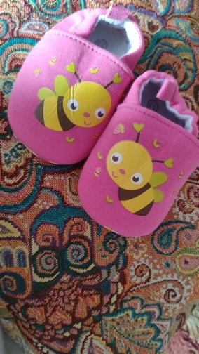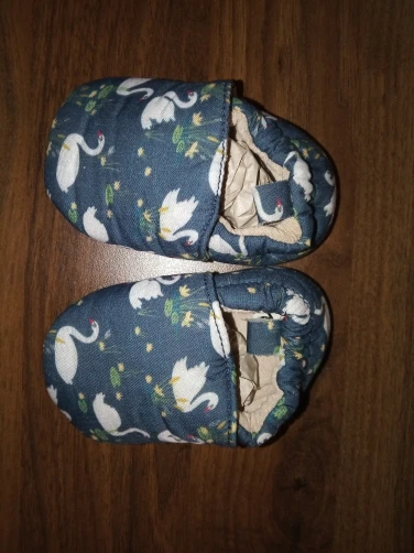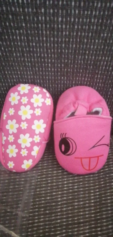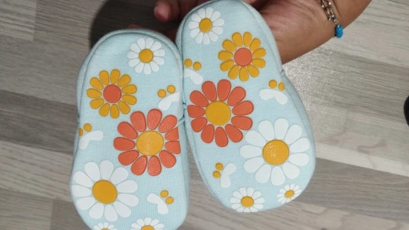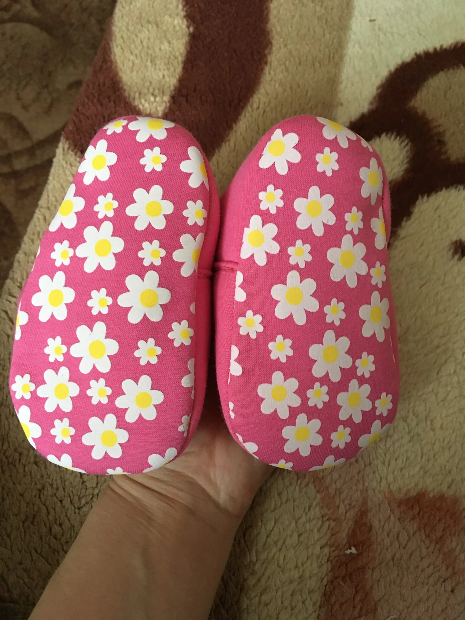 красивые тапочки, размер 5 подошел ребенку 1.3 года, ножка 12см. Но... Тапки пахнут химией, ножки вспотели спустя пару минут, как померили! На голую ногу не вариант. Если только на носочек и по холодному полу. Еще почему-то подошва одного тапочка изначально грязная, как только открыла. Все бы ничего, но ноги очень сильго вспотели, вряд ли дочка будет носить.