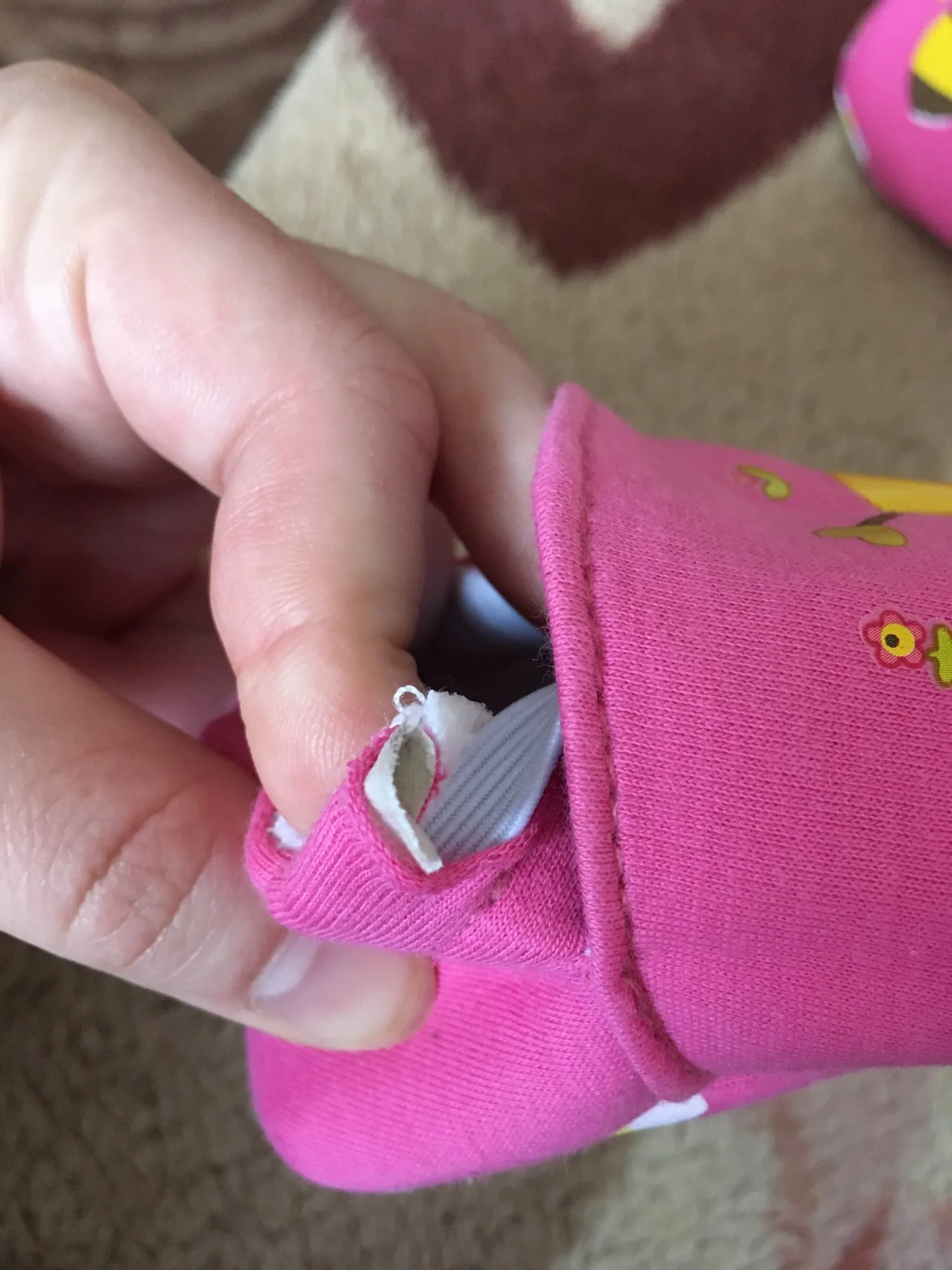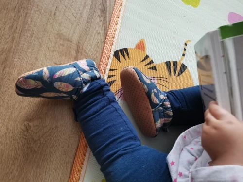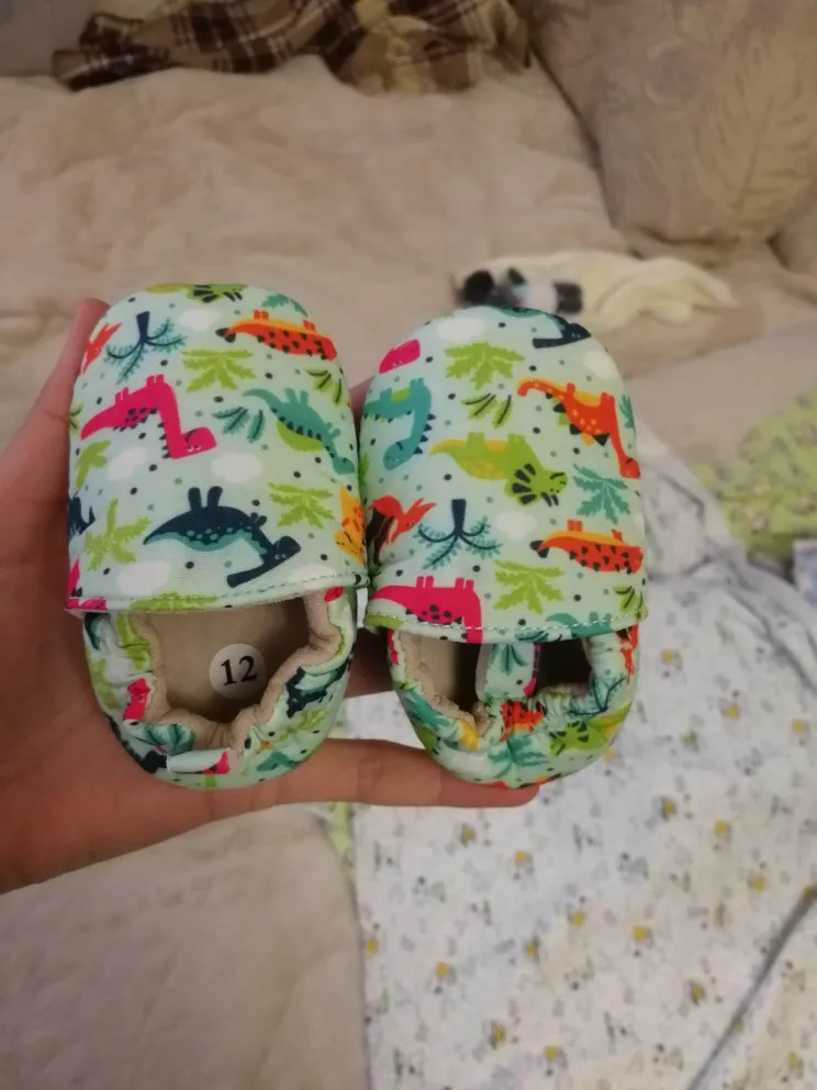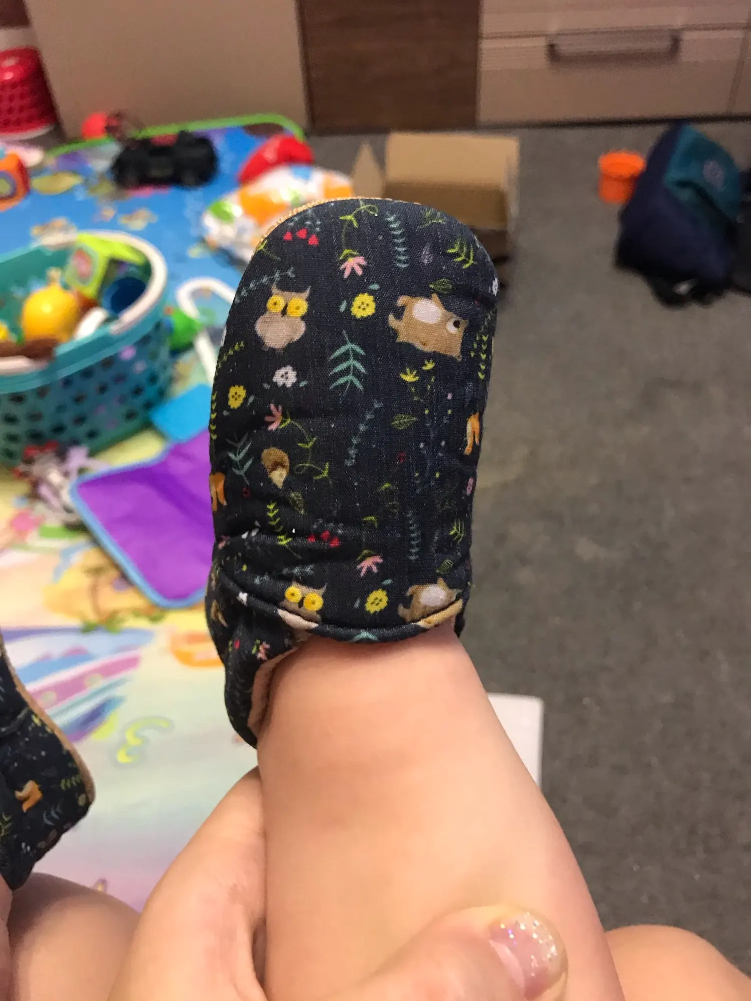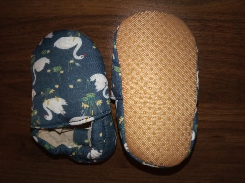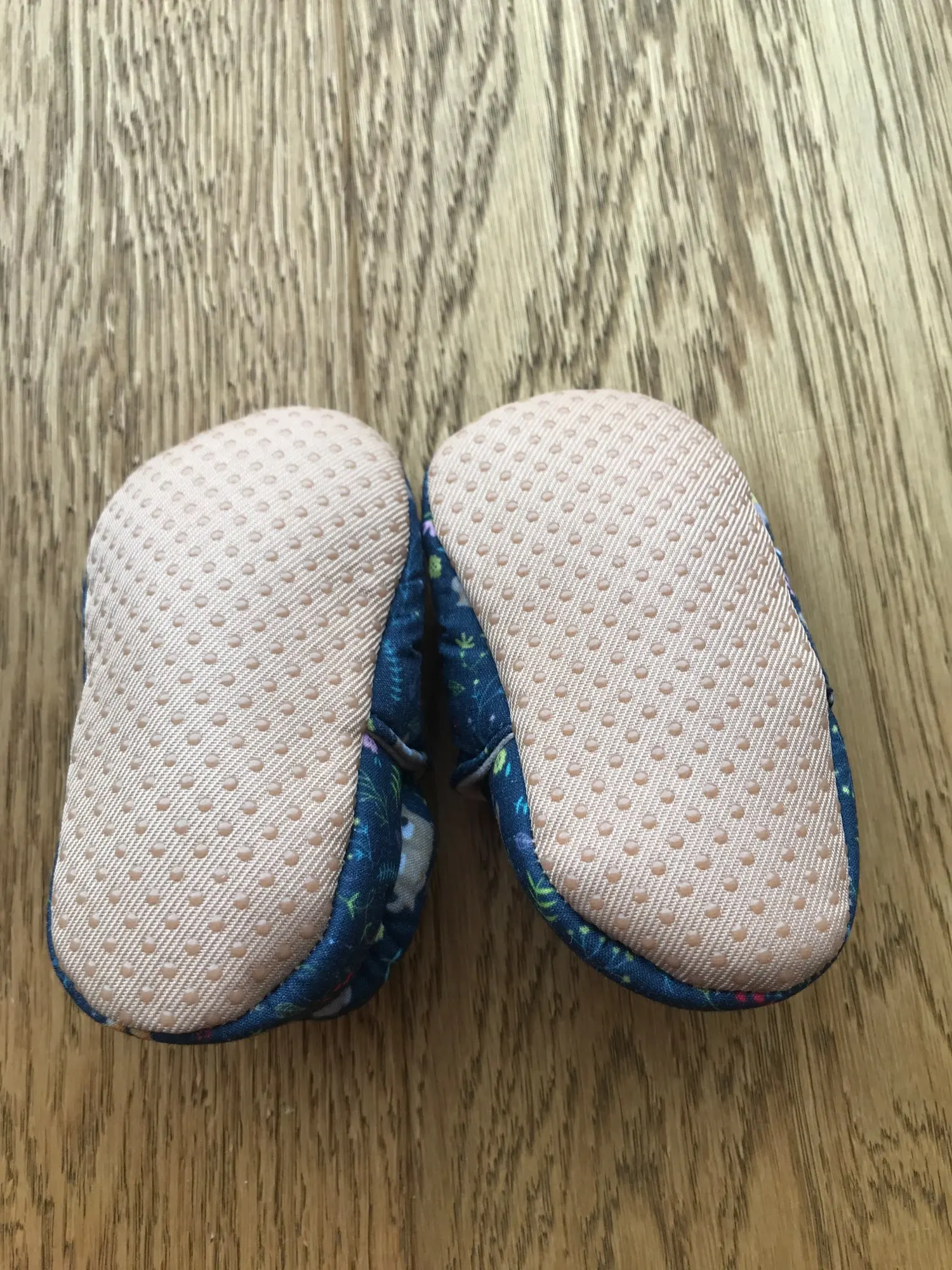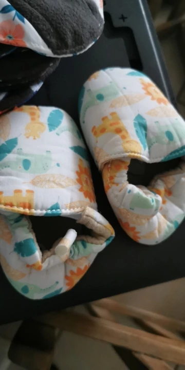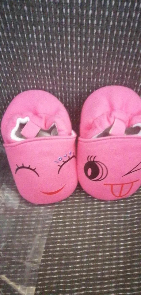 красивые тапочки, размер 5 подошел ребенку 1.3 года, ножка 12см. Но... Тапки пахнут химией, ножки вспотели спустя пару минут, как померили! На голую ногу не вариант. Если только на носочек и по холодному полу. Еще почему-то подошва одного тапочка изначально грязная, как только открыла. Все бы ничего, но ноги очень сильго вспотели, вряд ли дочка будет носить.