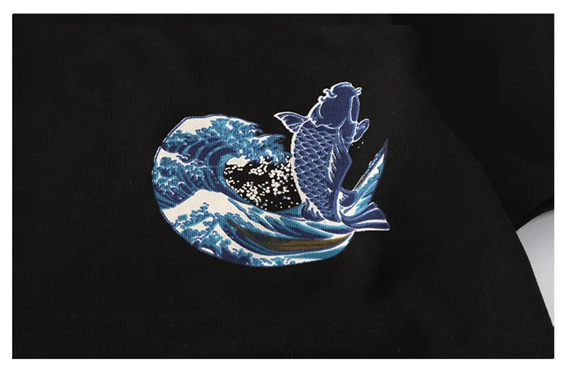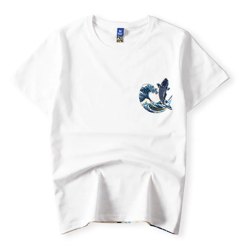 Модная черная, белая футболка с коротким рукавом 2021, топы в японском стиле укиё-э с волнистыми карпами и рыбками, футболки, уличная одежда, хлопковая футболка