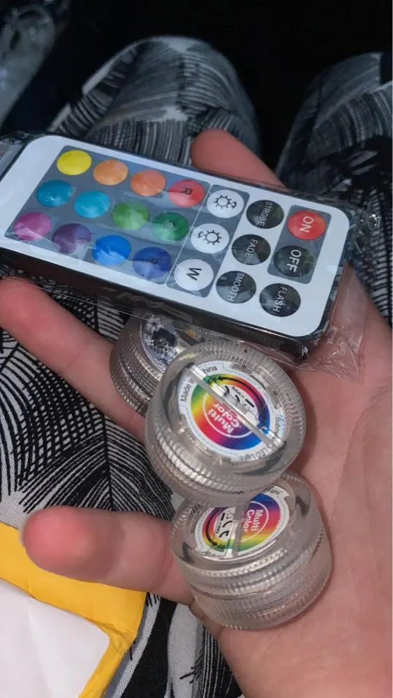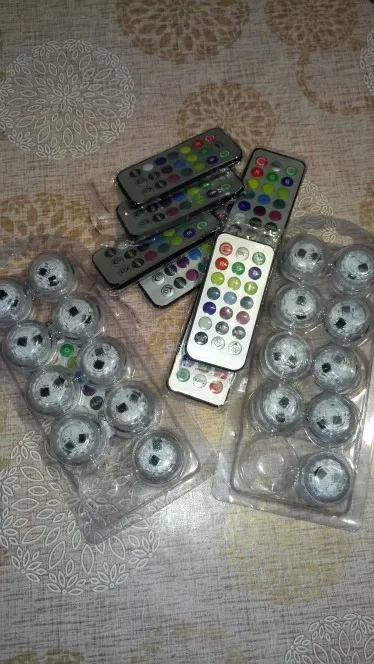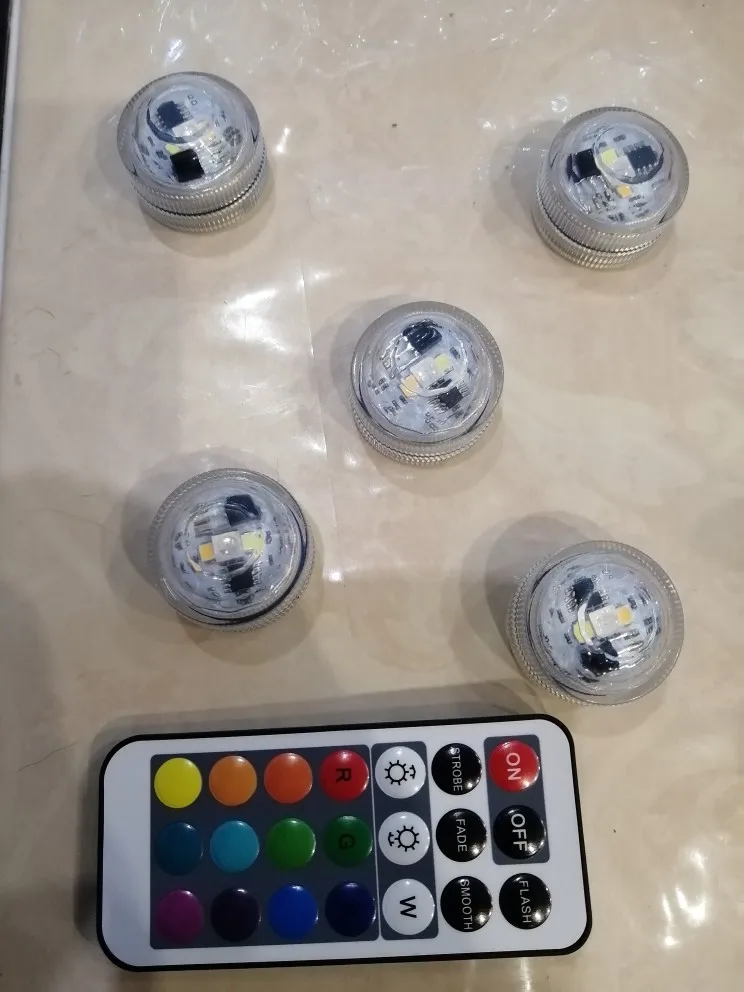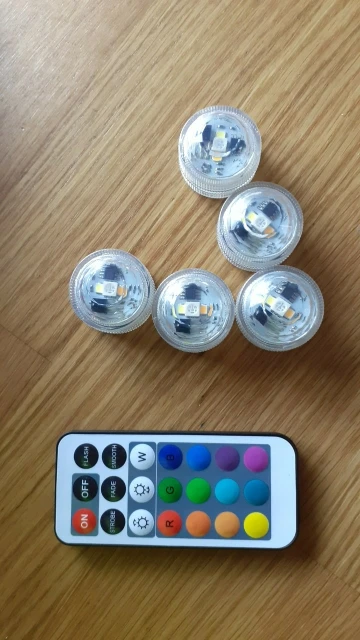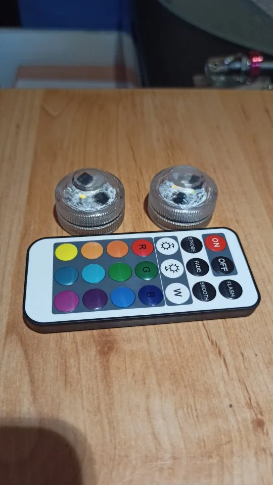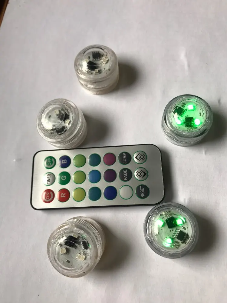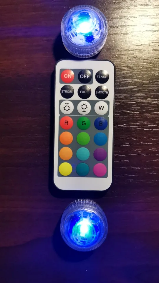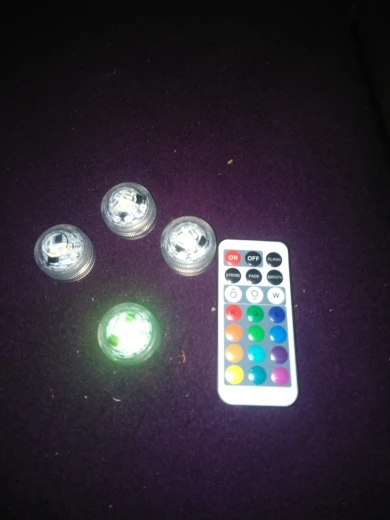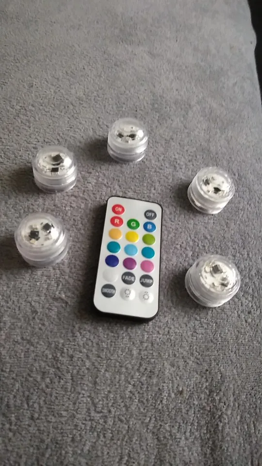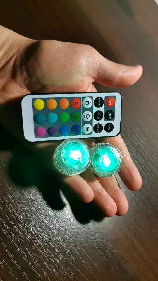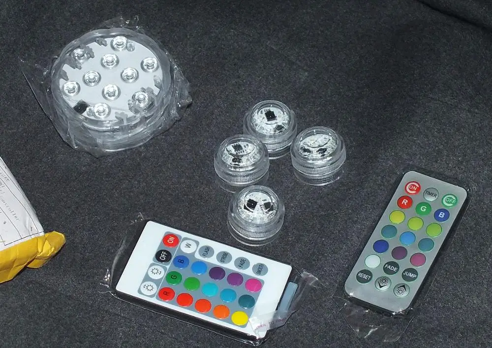 Классные штучки. С пультом. Работают от одного пульта. Разные режимы работы. Резиновая прокладка, водонепроницаемые. Для бассейна будет смотреться ОК. Две батареи в каждой. Для активации открутить и вынуть бумажную прокладку.