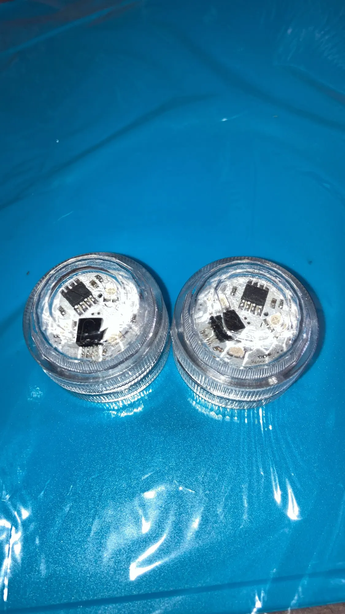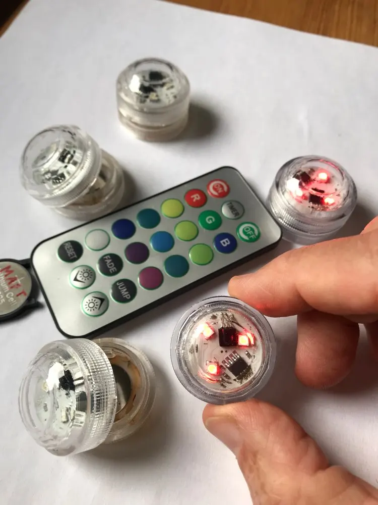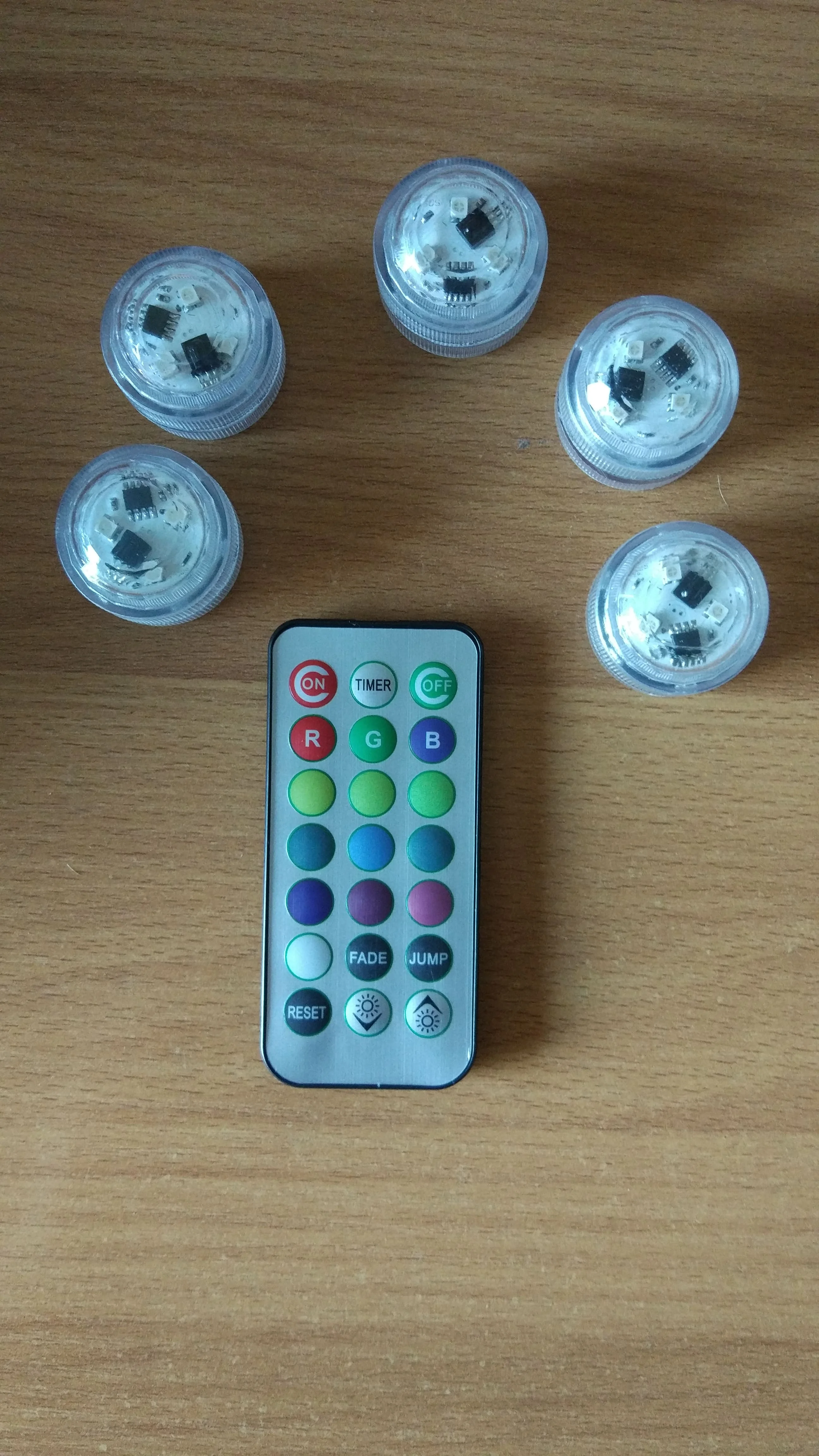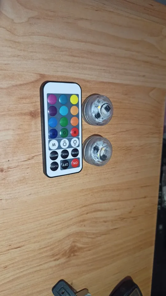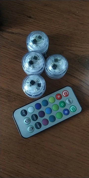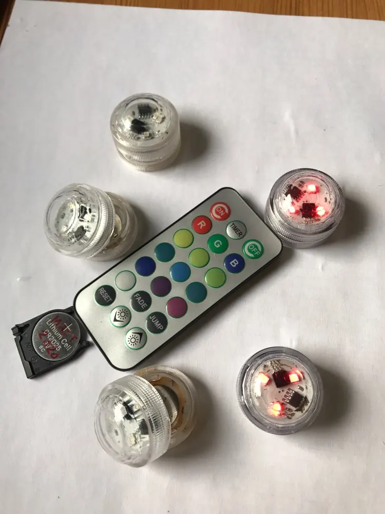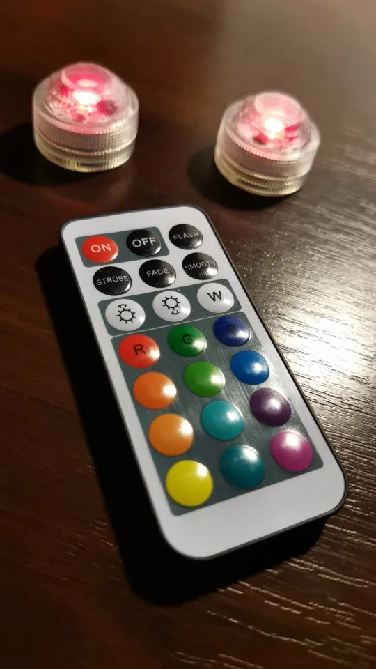 Классные штучки. С пультом. Работают от одного пульта. Разные режимы работы. Резиновая прокладка, водонепроницаемые. Для бассейна будет смотреться ОК. Две батареи в каждой. Для активации открутить и вынуть бумажную прокладку.