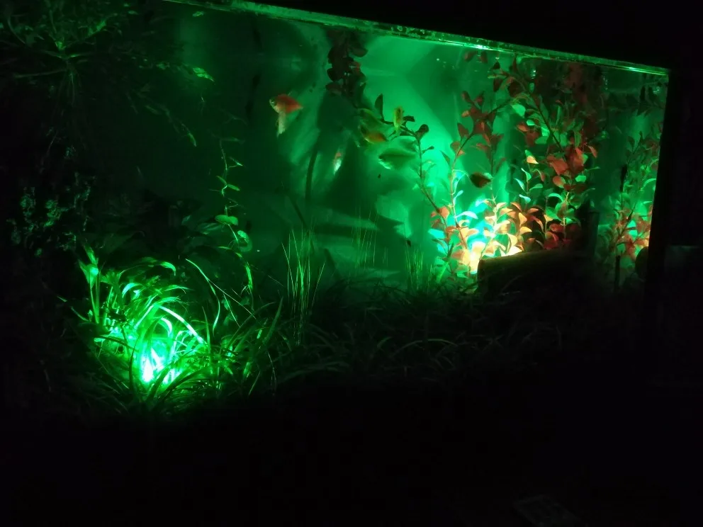 Отличный товар, плавает в аквариуме. Чтобы все заставить светить одновременно, надо сначала перевести их на белый свет с пульта. Иначе все идёт вразнобой.