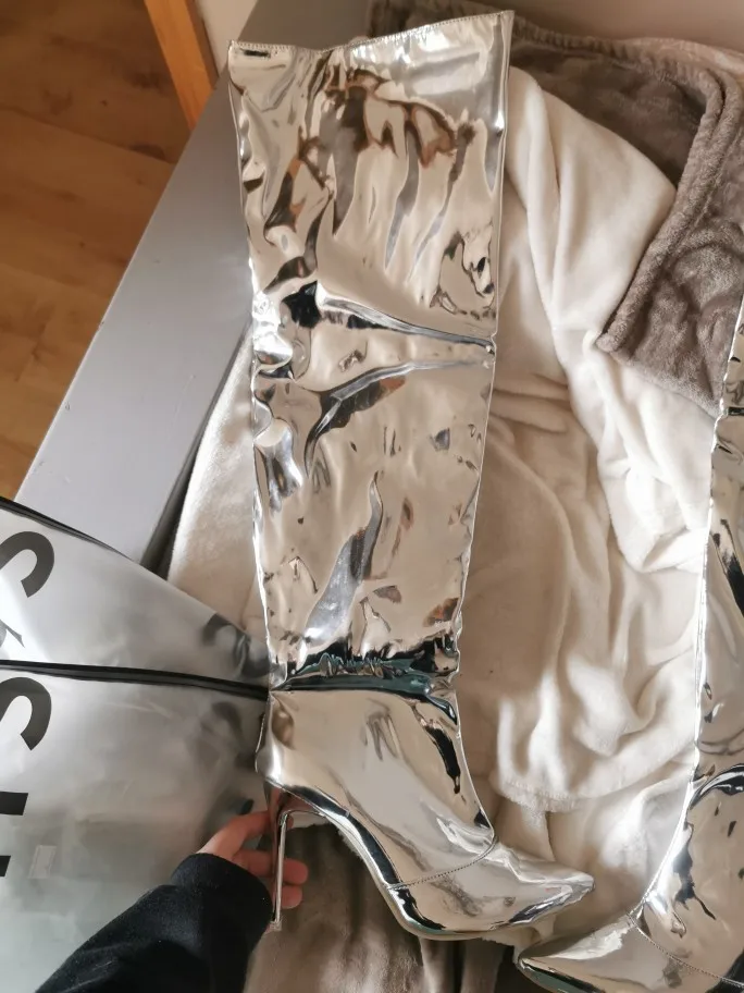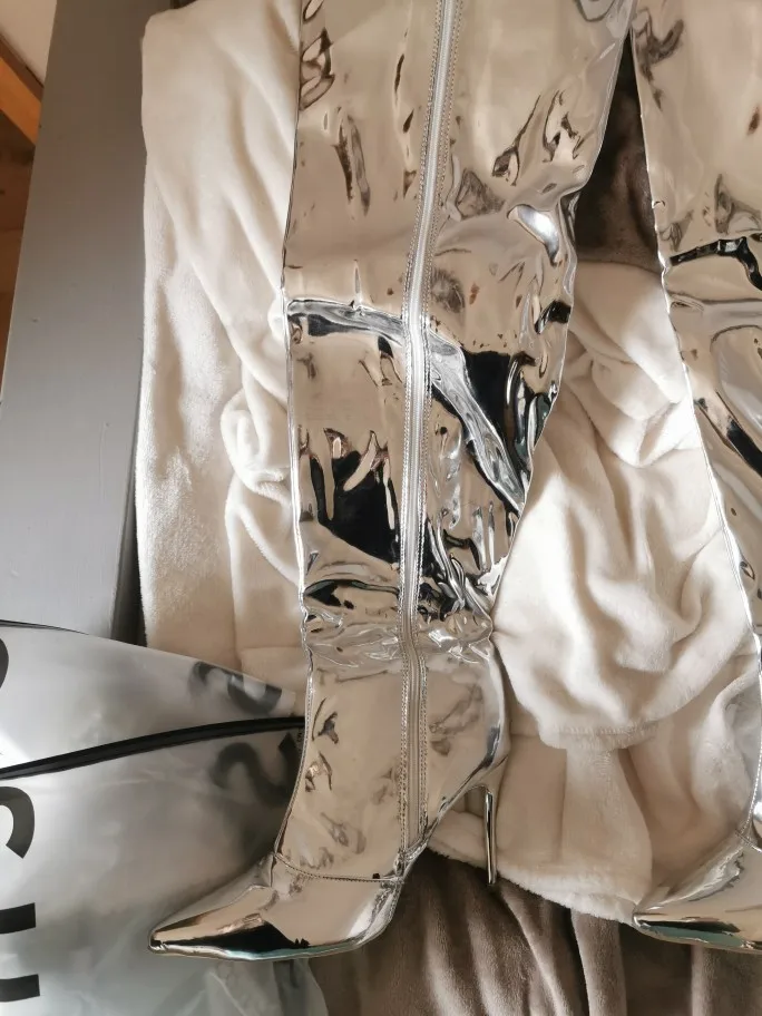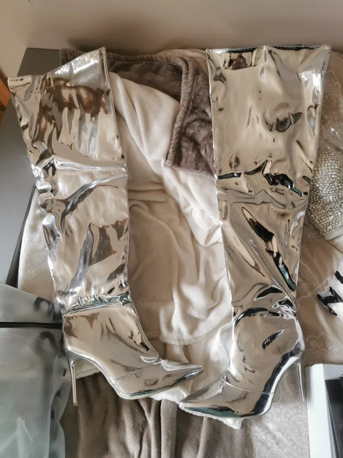 Женские сапоги из искусственной кожи, на высоком каблуке, с острым носком, с зеркальным покрытием, на молнии, модель 43, размера плюс