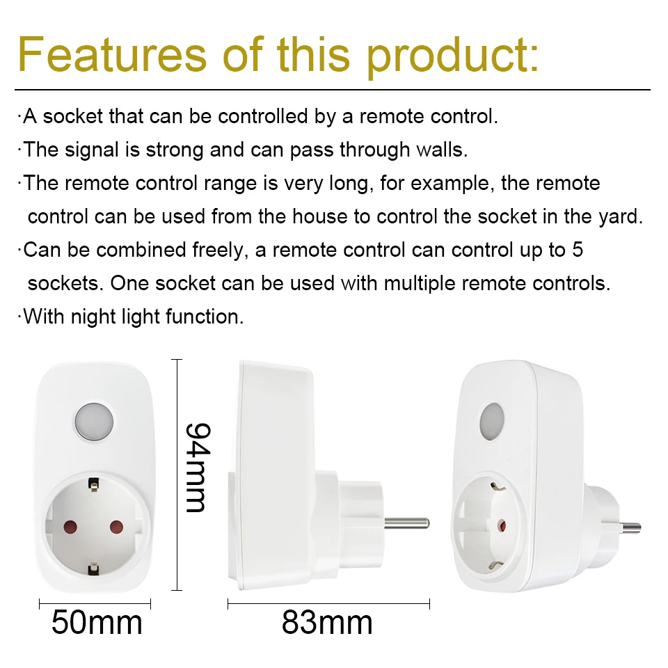 Особенности:◆Розетка может управляться вручную или с помощью пульта дистанционного управления.◆Ночной светильник может управляться только передатчиком.◆Приемник розетки по-прежнему будет оставаться в режиме «OFF» после отключения питания, даже когда питание снова включается.◆ Передатчик и приёмник можно свободно комбинировать (передатчик или приёмник должны быть от нашей компании), нужно только программировать в соответствии с руководством."1 розетка только" представляет только гнездо (за исключением пульта дистанционного управления); "1 удалитель только" представляет только пульт дистанционного управления (за исключением гнезда). Пульт дистанционного управления и розетка этого продукта не могут использоваться с другими продуктами, даже если частота одинаковая. Поэтому, если вы не приобрели этот продукт, пожалуйста, не приобретайте отдельный пульт дистанционного управления или гнездо, в противном случае вы не можете использовать его с вашим продуктом. Большое спасибо за понимание.Розетка-приемникВход Напряжение: 230 В переменного тока, 50/60 ГцМакс. Ток нагрузки: 16AЧастота передачи: 433 МГцПередатчикМощность передатчика: 1 секция DC12V 23A батареи(Убедитесь, что установка батареи правильная, продукт не включает батарею)