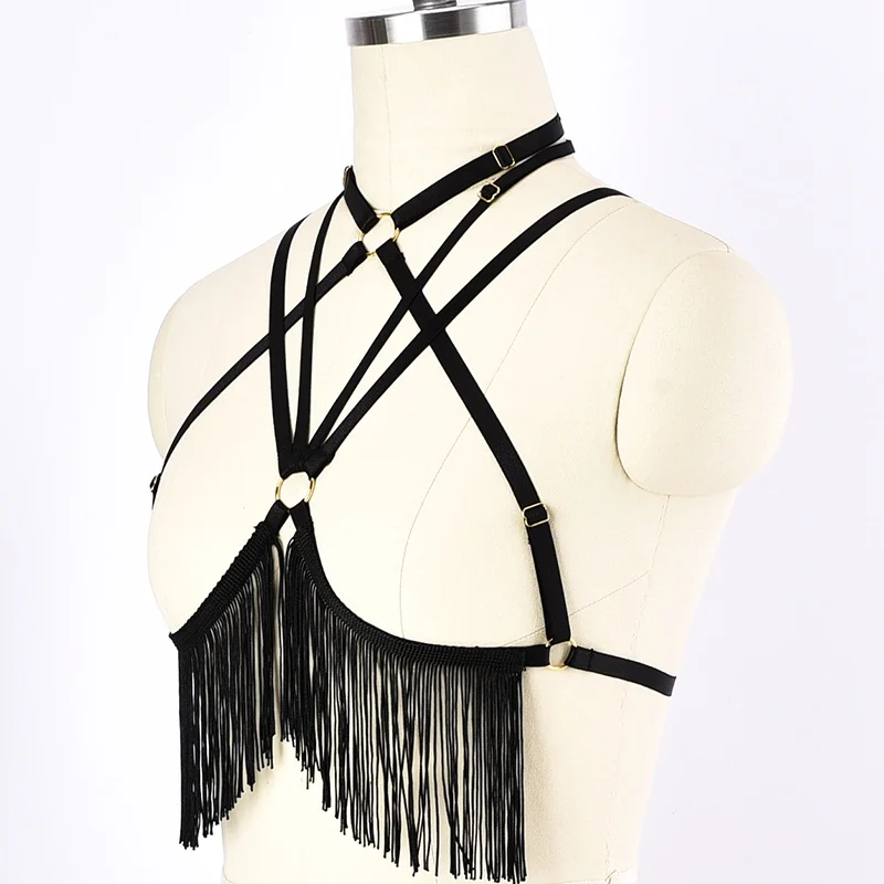 Черная портупея для тела с кисточками в готическом стиле, сексуальное нижнее белье, фетиш, богемный Топ для танцев на шесте, клетка, бюстгальтер, пояс
