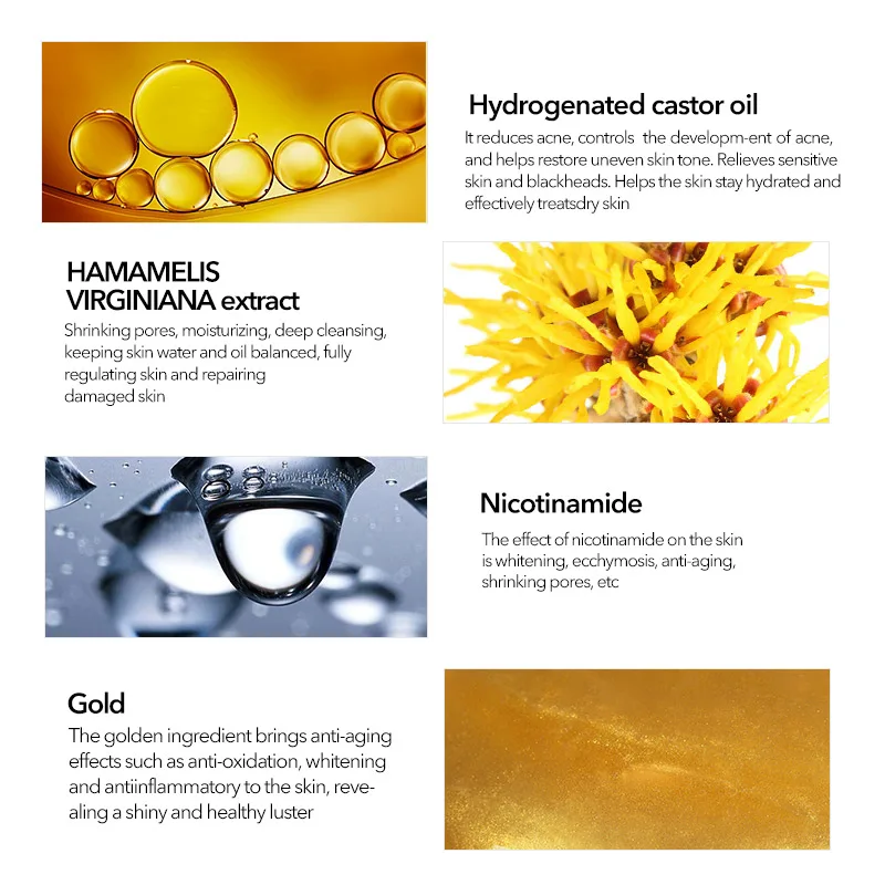 Золотой ингредиент приносит омолаживающие эффекты, такие как окисление, отбеливание и противовоспалительное для кожи, открывая блестящий и здоровый блеск