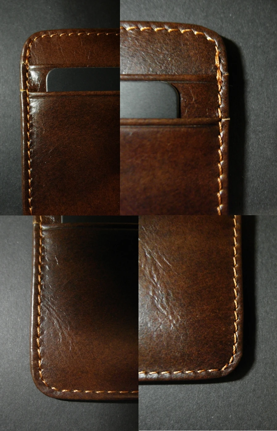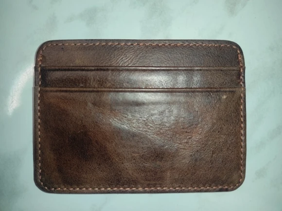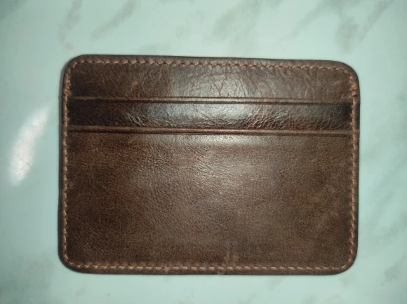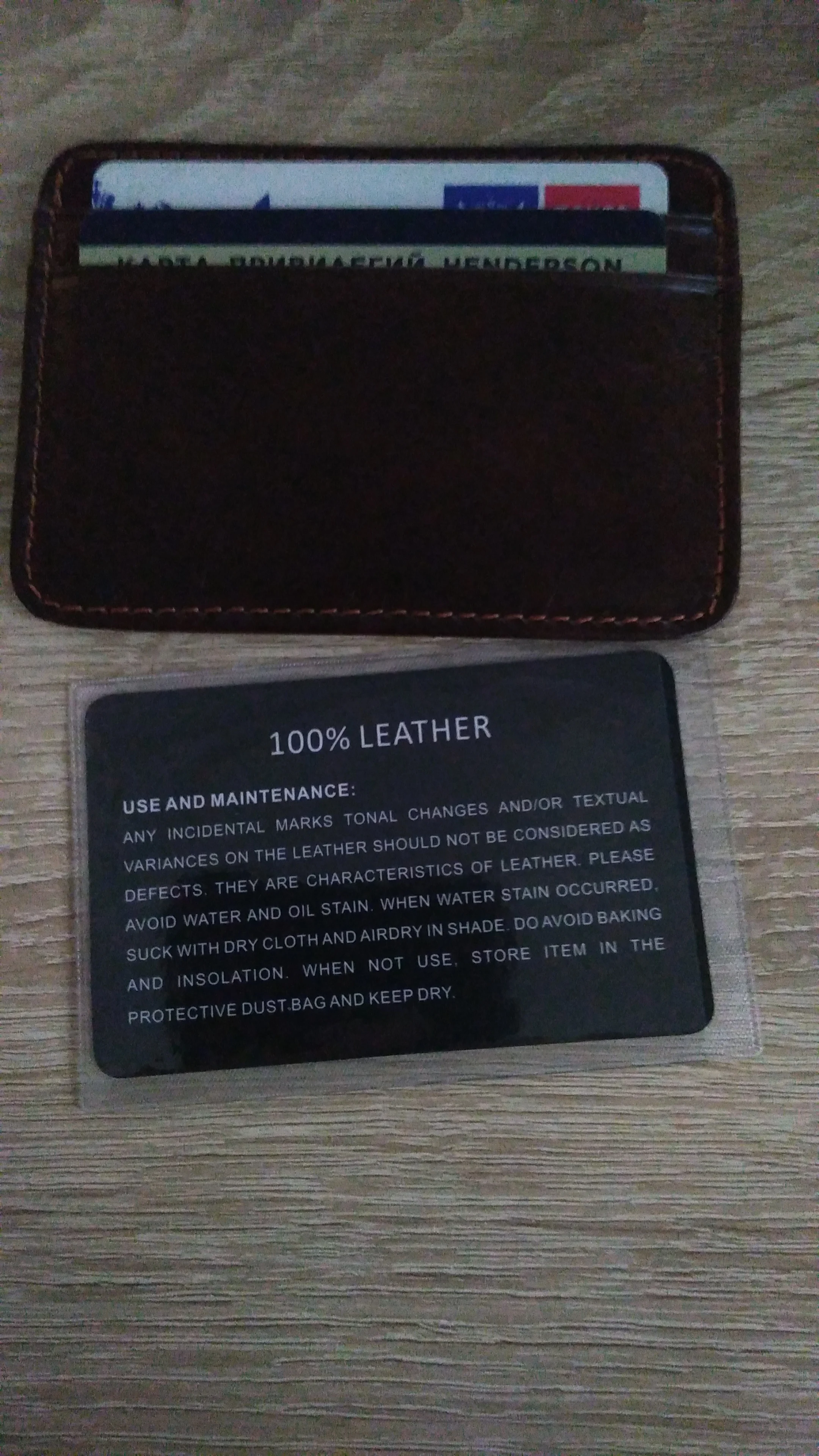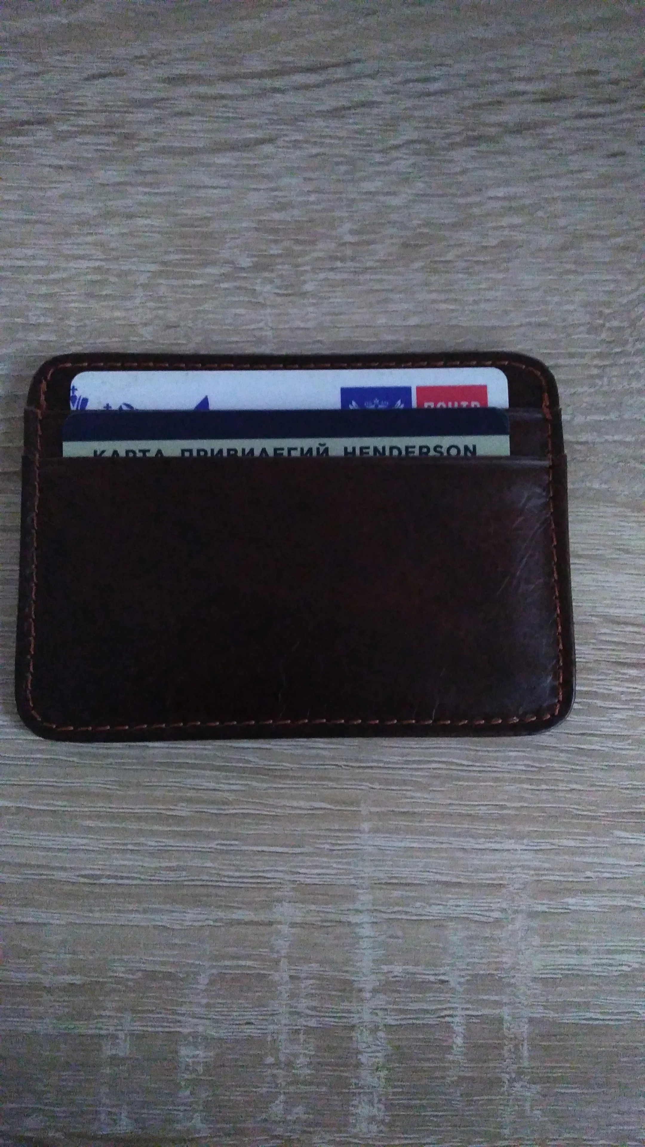 Качественный товар за свои деньги. Прошито достаточно хорошо. Посадка карточек достаточно глубокая. Сделано из остатков кожи (при желании можно найти несколько совсем мелких дефектов кожи - у меня одна точка подтерта и пару микровмятин в виде точек - это если с лупой искать). Хорошая скорость доставки. Хороший продавец. Найду чуть больше свободного времени и добавлю еще картинки.