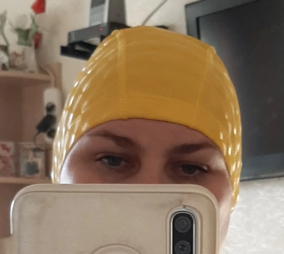 Тоже самое и с этой шапкой. Она тоже пропускает воду при первом погружениию Плавать на спине в ней невозможно. Она наполняется водой. Влосы полностью мокрые. В ушах вода. Попробуйте сами погрузить голову в этой шапке в воду. Что вы хотите увидеть на фото? Мои мокрые волосы? Как я воду из нее выливаю? Я ее не могу возвратить, потому, что я ее просто выкинула как непригодную.