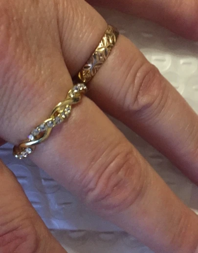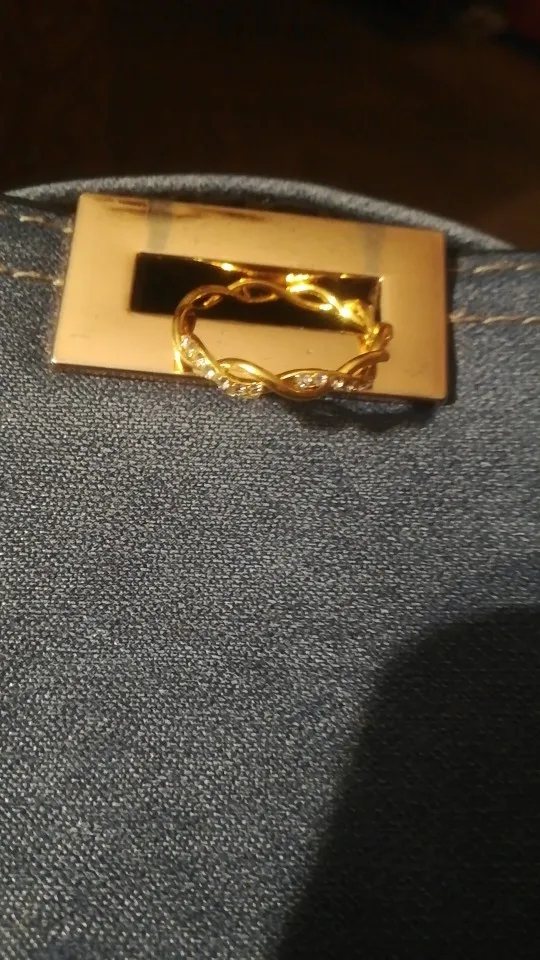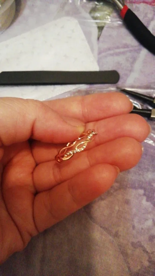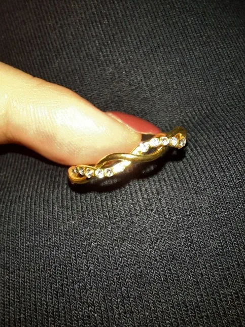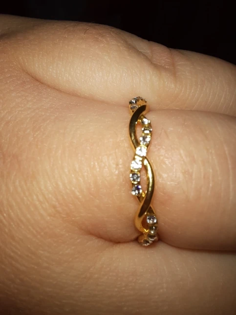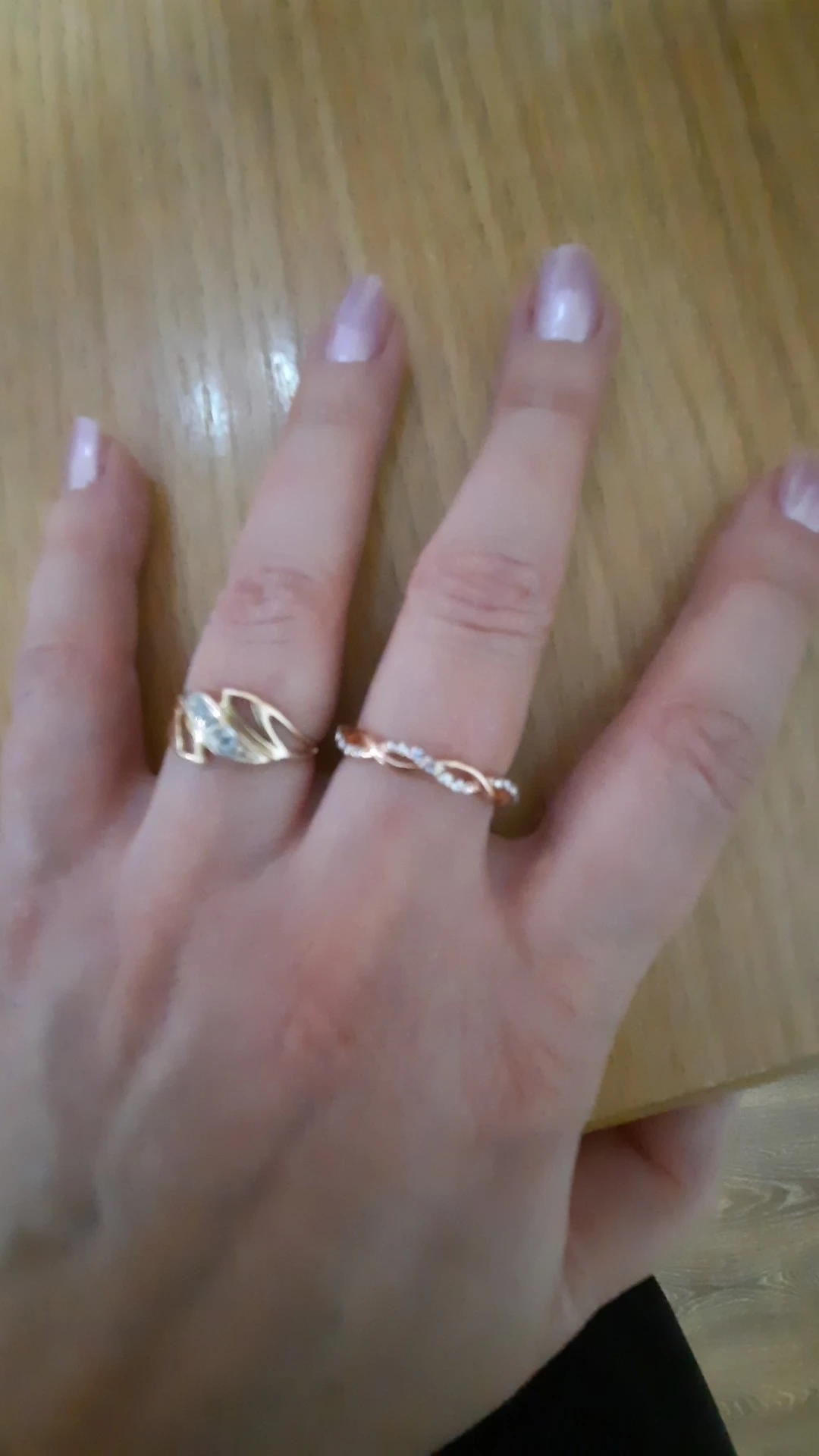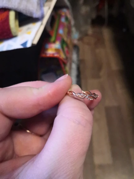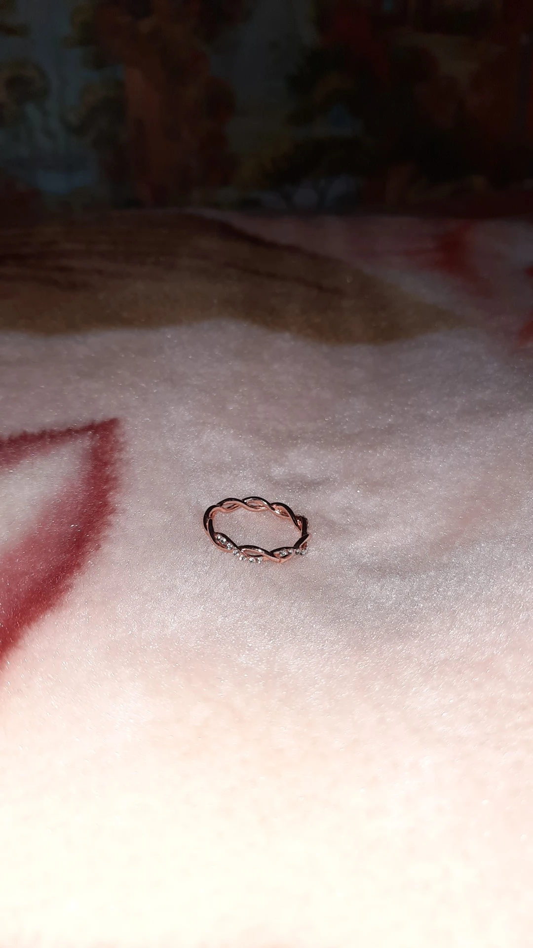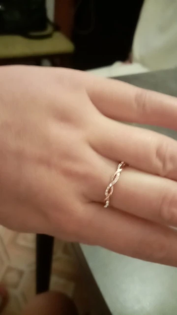 хорошее кольцо, правда я по размеру немного прогадала, надо было 7 размер брать, а не 8. Ну ничего страшного-залазиет аж на три пальца. Стразы все на месте. Тоненькое. Прилагаю фото со всех сторон. На последнем фото видно незначительный косяк,но это не влияет на носку кольца. Красивое, мне нравится. Рекомендую.