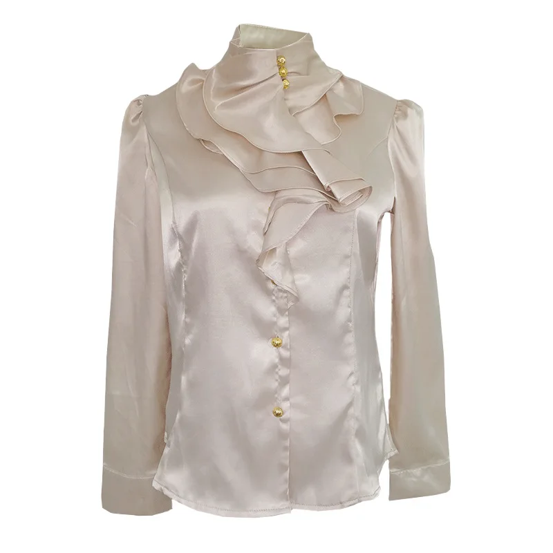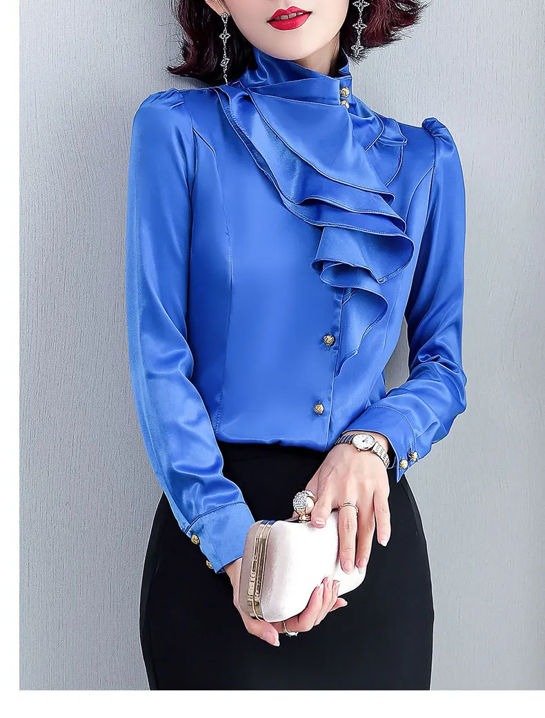 Женская шифоновая блузка, белая блузка с оборками и воротником-стойкой, с длинным рукавом, 2021