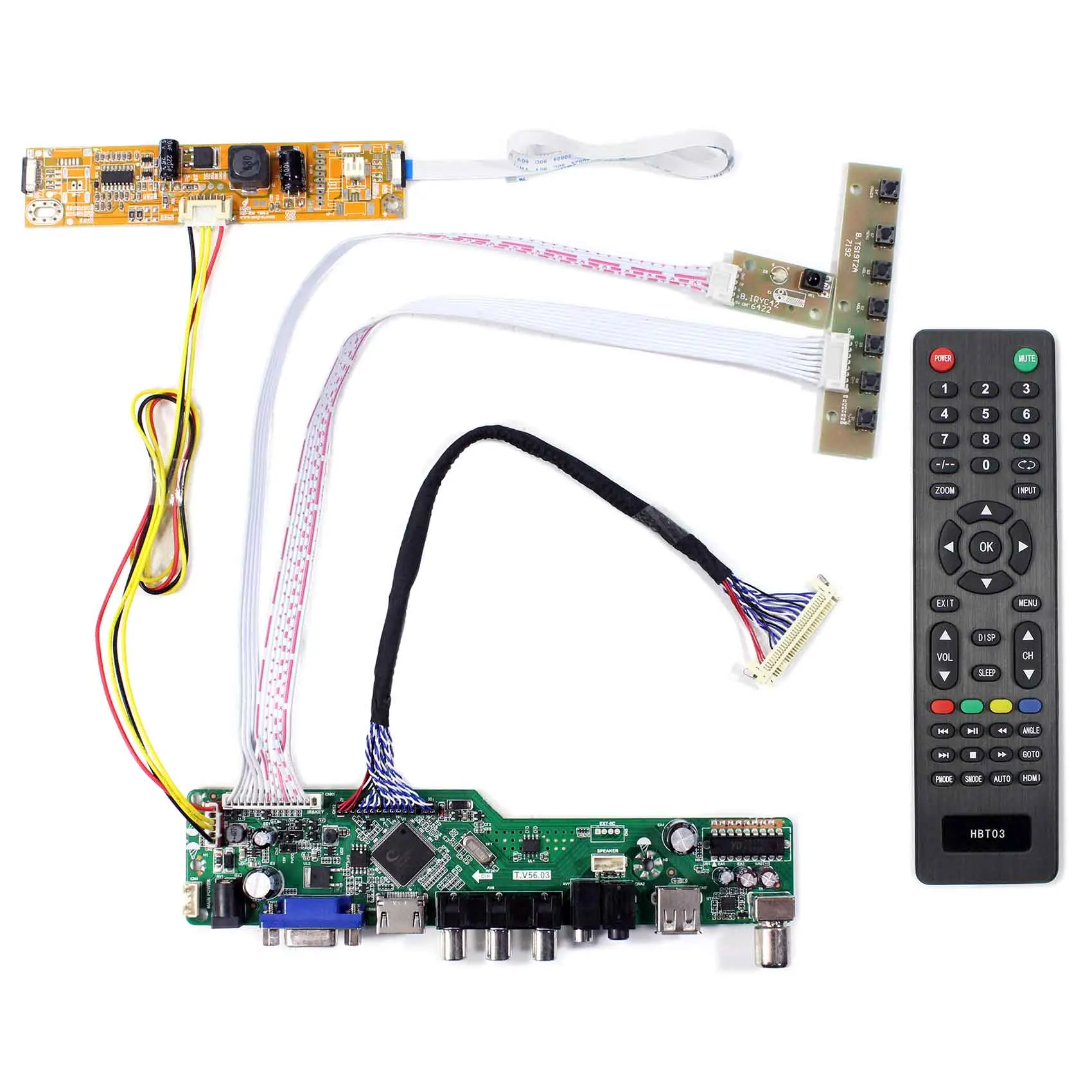 Упаковочный лист: 1 × HDMI VGA AV USB RF LCD плата контроллера T.V56.03 1 ×Плата инвертора 1 ×LVDSСигнальный кабель 1 × Клавиатура с кабелем 1 × Пульт дистанционного управления (Батарея в комплект не входит)