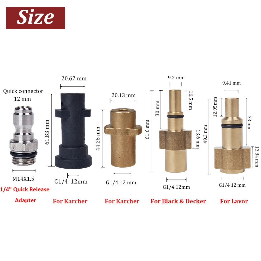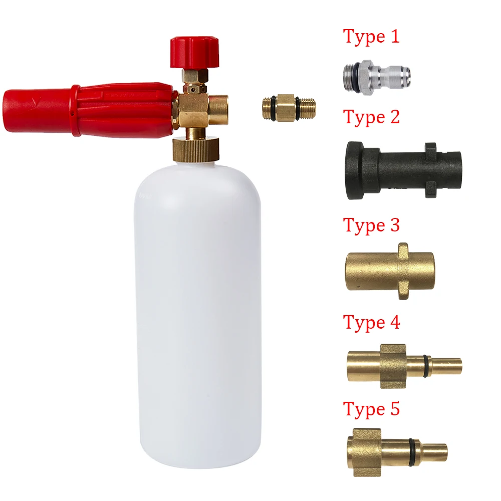 Характеристики:• Диапазон давления: 2000 - 5000 psi• Емкость бутылки: 1000 мл (1 л)• Материал конструкции: твердая латунь, устойчивый нейлон, HDPE бутылка• Максимальная температура воды: 60 °C (140 °F)• Химическая стойкость: Да• Расход пены регулируется: Да• Регулируемая ширина распыления: ДаПримечание:Тип 1: 1/4 "быстроразъемныйТип 2 и тип 3: для Karcher K2-K7Тип 4: для Black & Decker/для Skil 0760/для Makita/для AR Blue/для Foamer Two-Time/для серии Bosche AQT after year 2013Тип 5: для Lavor/для Sterwins/для Champion/для Vax/для Parkside/для Foreman/для HitachiПосылка включает:1. 1 х пластиковая труба2. 1 x латунный генератор пены тела3. 1 x пенная бутылка для мытья автомобиля 1L4. 2 адаптера (тип 1 только 1 адаптер)Как использовать:1. Поместите PTFE ленту на латунную трубку (две нити). Каждая нить требует 50 см PTFE ленты.2. Поместите адаптер с латунной трубкой и всасывающей трубкой на пенопластовое устройство.3. Заполните бутылку жидкости с нужным количеством шампуня.4. Заполните бутылку с водой (для достижения наилучших результатов рекомендуется использовать теплую воду, 20% шампуня + 80% воды).5. Встряхните бутылку жидкости, чтобы тщательно смешать шампунь с водой.6. Прикрепите бутылку жидкости к пенопластовому блоку.7. Прикрепите адаптер к пистолету для мойки под давлением, а затем он готов к использованию.
