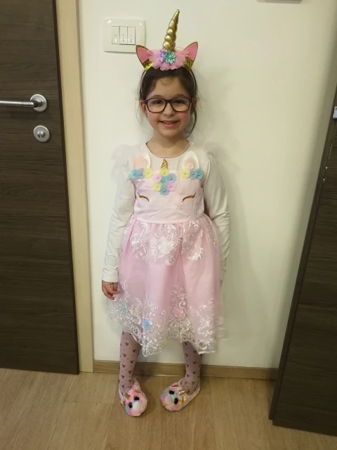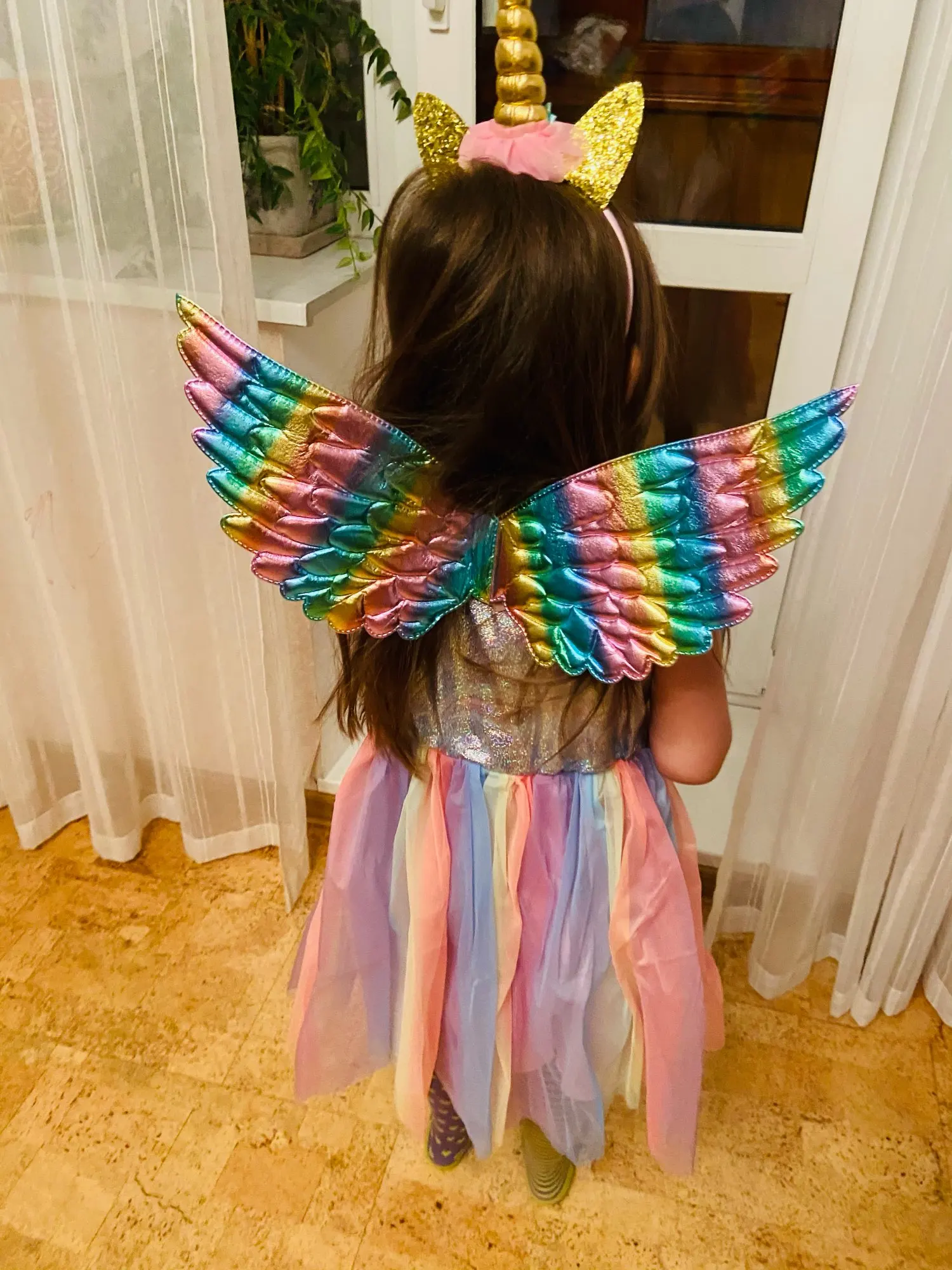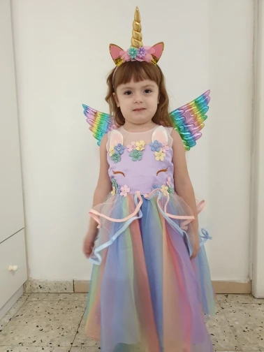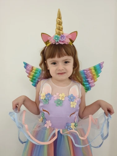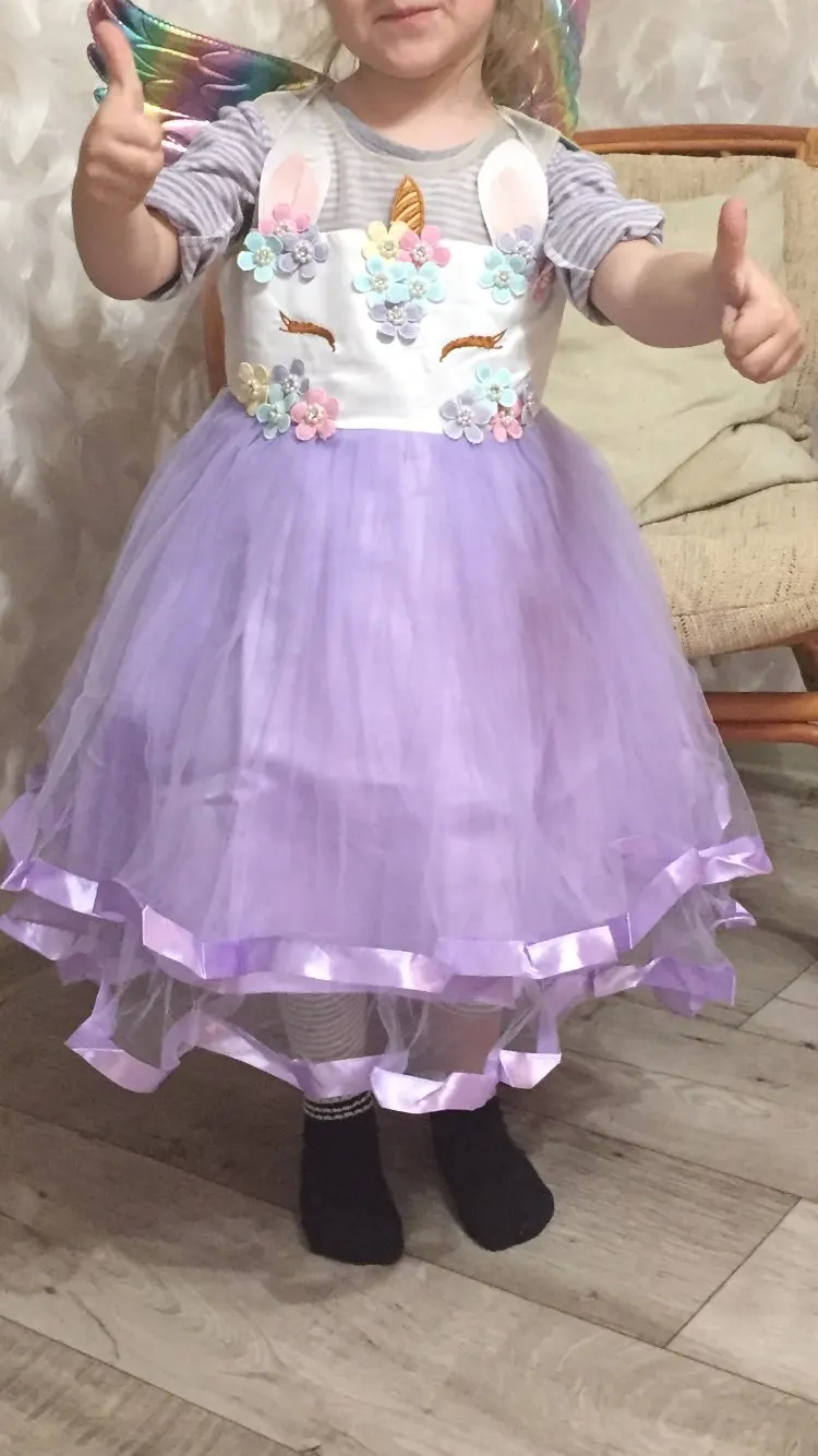 Очень красивое платье, цвет яркий, сочный, аккуратно пошито! Ободок с рогом без капелек клея, все очень аккуратно! Крылышки качественные! Быстрая доставка! На девочку ростом 116-120 в самый раз! Спасибо продавцу!