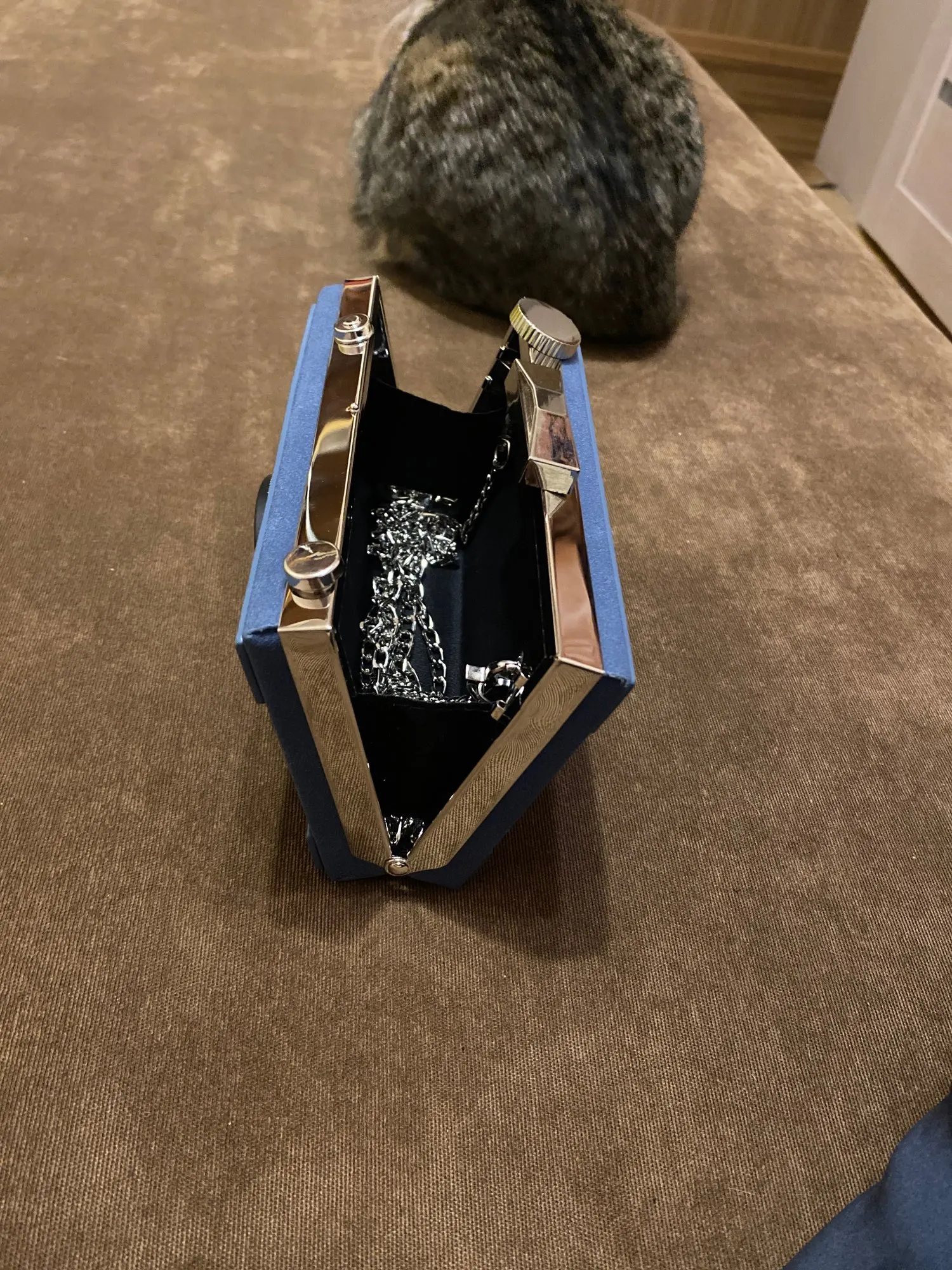 Кошелек очень хорошего качества и соответствует фото. Поставляется с тканевым чехлом, чтобы сохранить его и не подвергать его воздействию. Идеальная отделка. Цепь не очень хорошего качества, но ее можно заменить без проблем.
