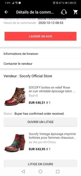 Разочарован! Я связался с продавцом на приеме, потому что есть проблема с таблицей размеров, я следовал таблице размеров, но обувь слишком маленькая! Указано, что возврат возможен, продавец не уважает его, который ничего не хочет узнать, я даже не могу рассмотреть возможность обмена. Он ясно ответил мне, что обувь будет расти со временем. Я совсем не рекомендую. Я думал, что Ali express отреагировал бы на это, потому что это ложная информация о возможности возврата.