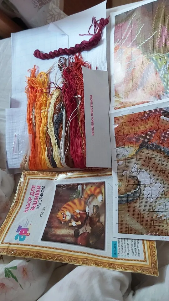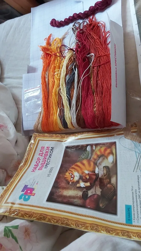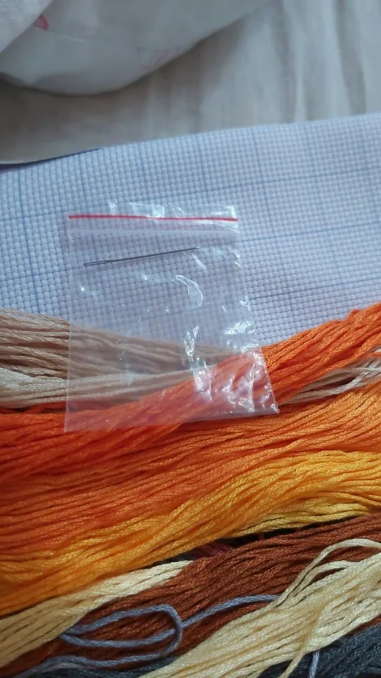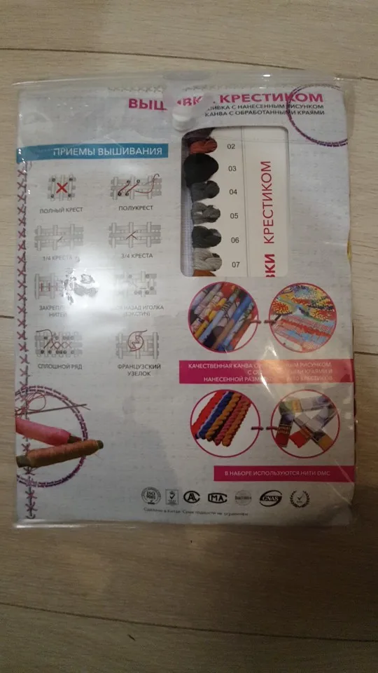 Посылку получила очень быстро. Посылка отслеживалась. Нитки яркие, канва размечена, но не оверложена. Схема четкая и достаточно крупная. Жаль только указаны номера ниток по схеме и не указаны номера ниток ДМС. Продавцу отдельная благодарность за оперативность и подарочек ( моточек ниток ).