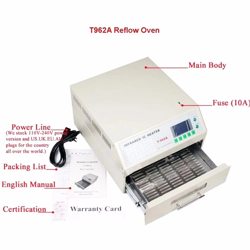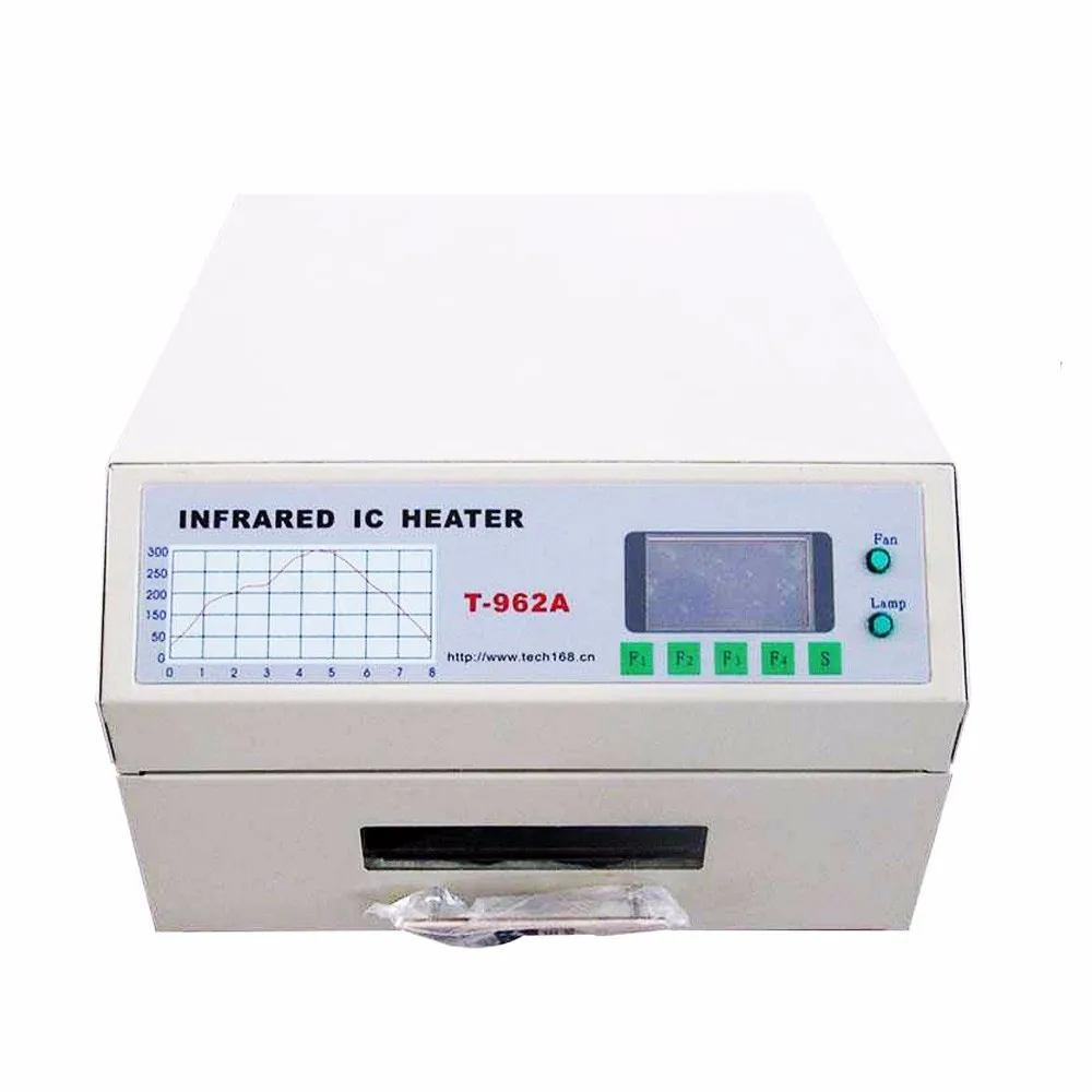 Инфракрасный IC НАГРЕВАТЕЛЬ T962A является микропроцессором, контролируемым оплавлением печи. Он используется для эффективной пайки различных SMD и BGA компонентов. Весь процесс пайки может быть завершен автоматически, и он очень прост в использовании. В этой машине используется Мощное инфракрасное излучение и циркуляция потока горячего воздуха, поэтому температура остается очень точной и равномерно распределена.