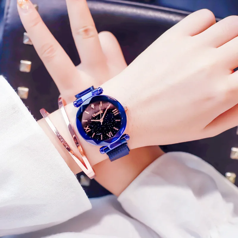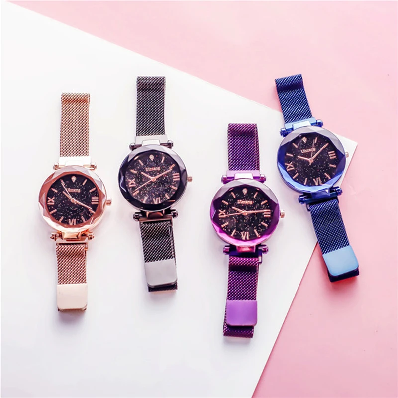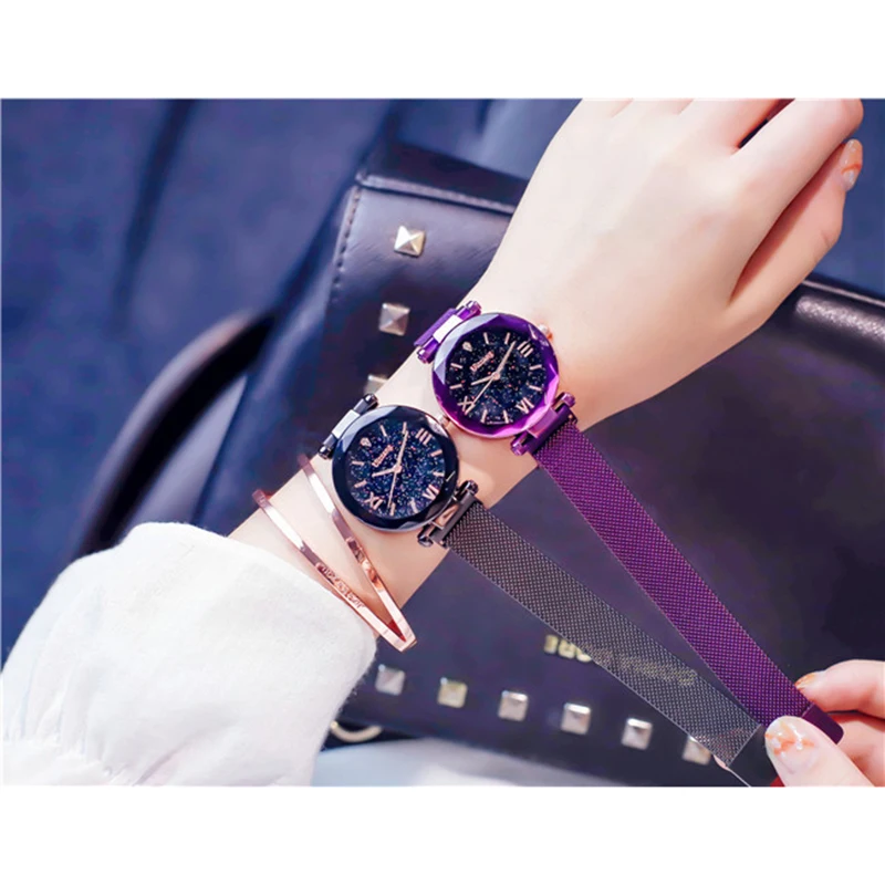 Женские часы Ulzzang, с кристаллами, звездным небом, фиолетовые, на стальном ремешке, с магнитной застежкой, с римскими цифрами, подарочные часы