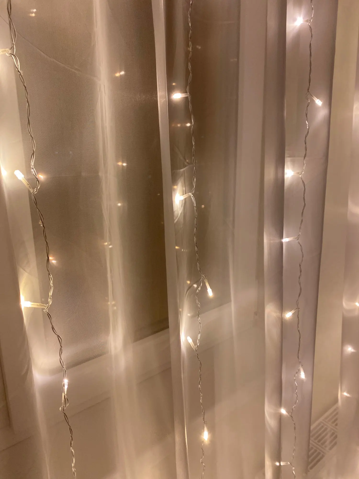 Мягкий, приятный свет- наливает комнату. Уютно и красиво. Выбрали 2.5м. От потолка до пола-самое то. Уменьшили промежутки между "висюльками" до 10 см смотав провод.