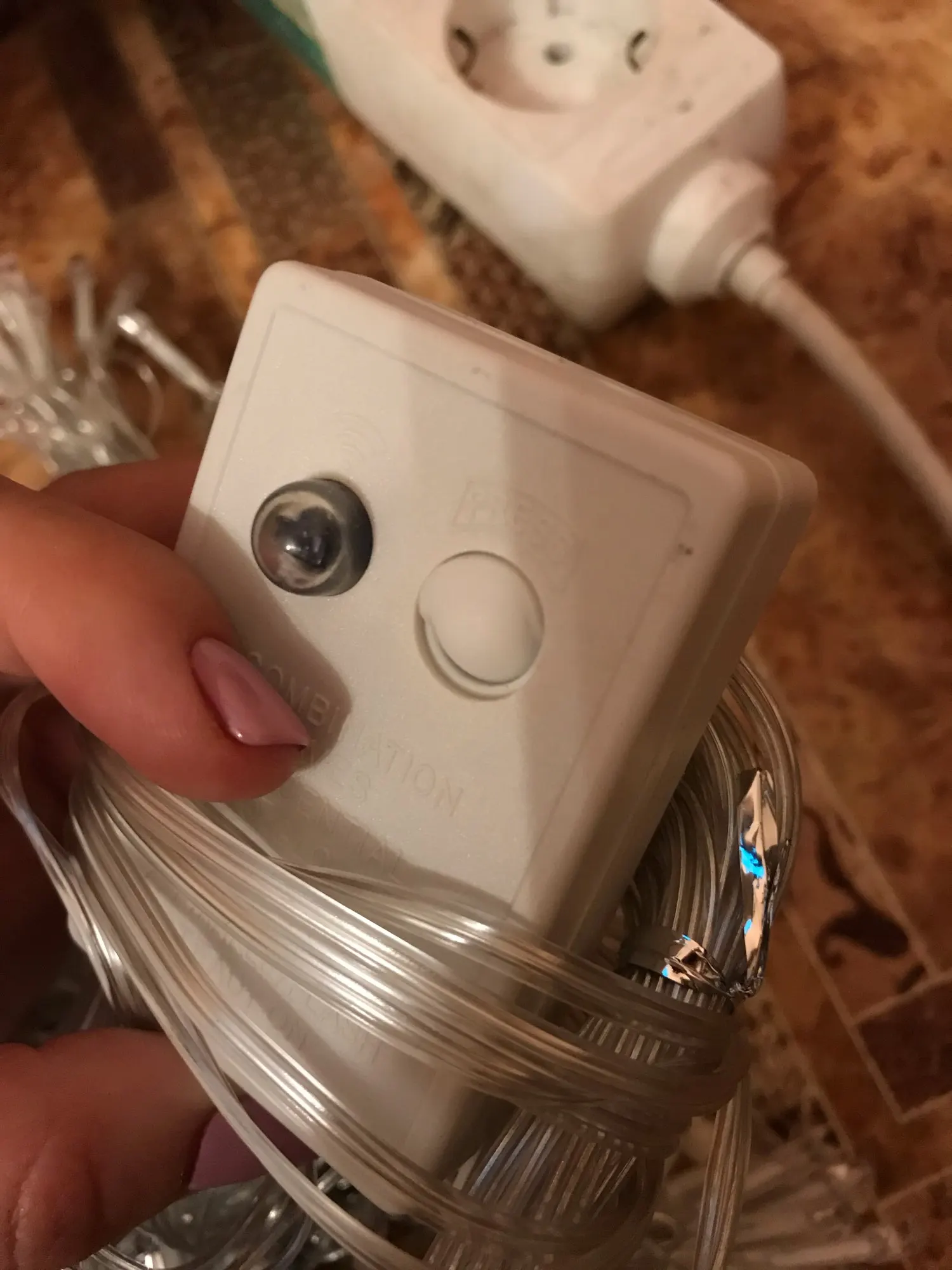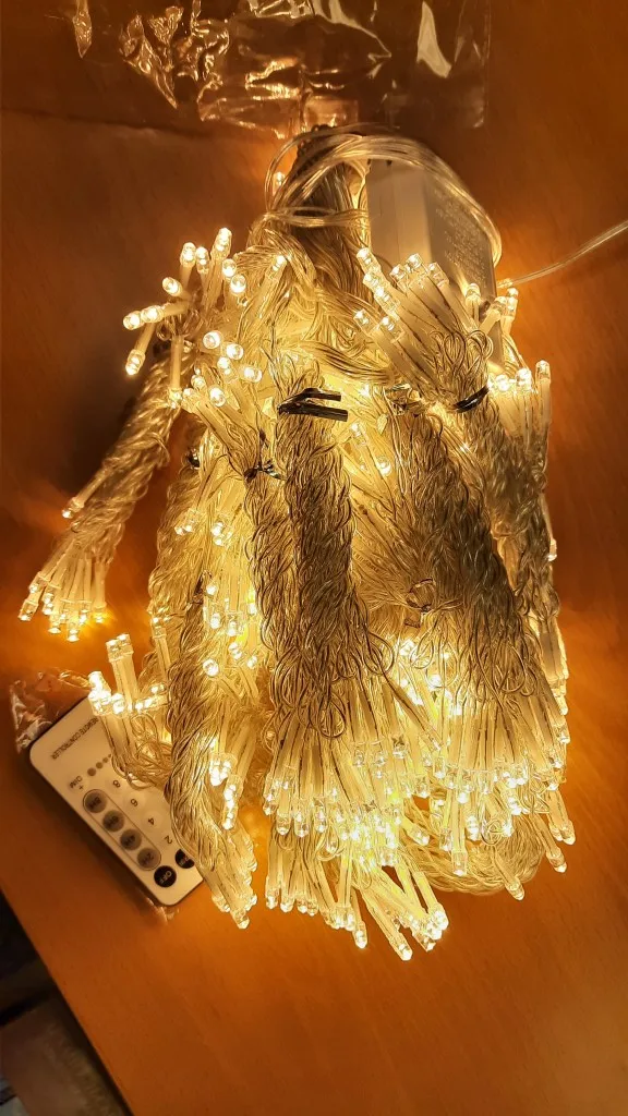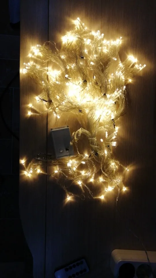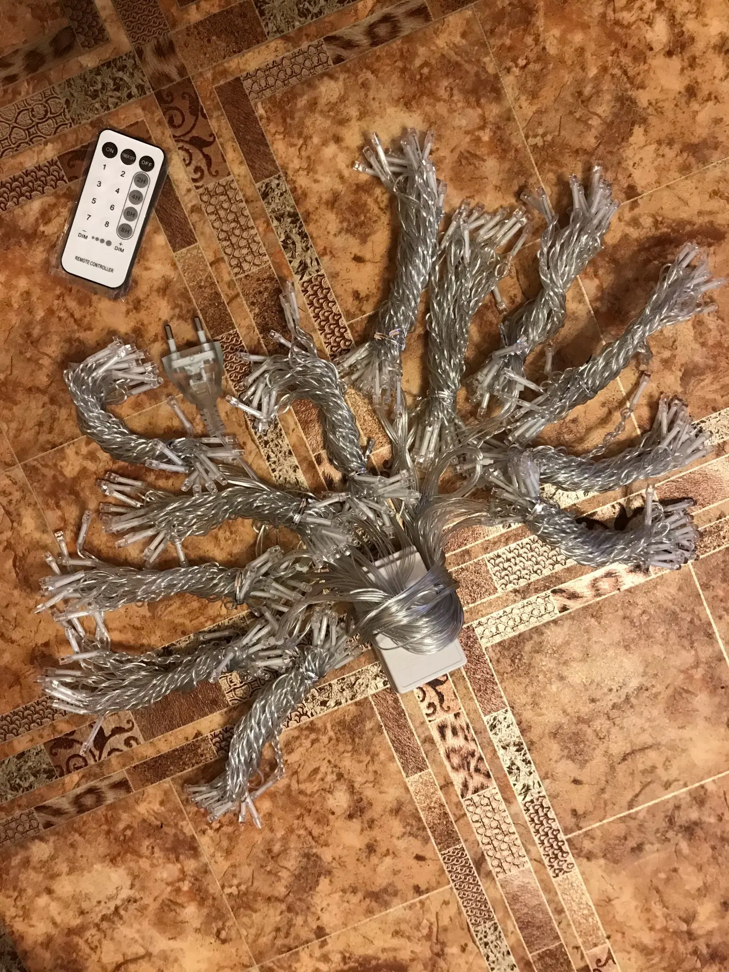 Гирлянду заказывали из России, шла она 2 недели. Всё пришло целое и рабочее, хоть и упаковано было в пакет и тонкий уплотнитель. Трёхметровая гирлянда состоит из 12-ти нитей. Пульт в комплекте хоть, но мы пока не пользовались. В самой коробочке, где переключаются режимы, была вдавлена кнопка, пришлось её выковыривать. Гирлянда очень красиво светит, я выбрала тёплый свет. Очень довольны гирляндой.