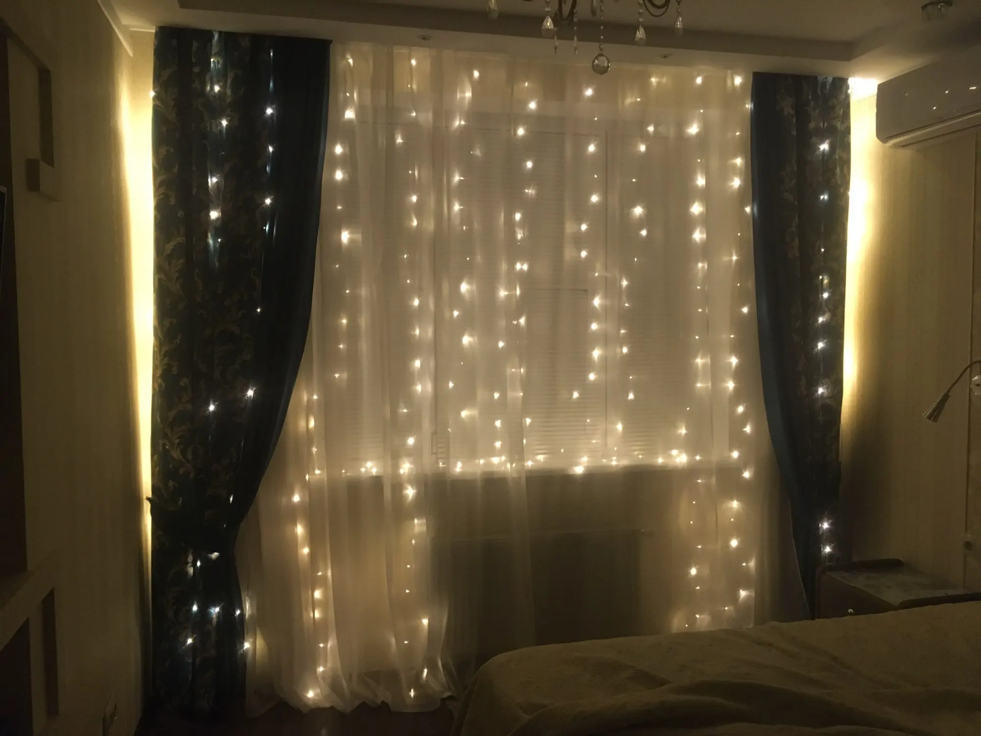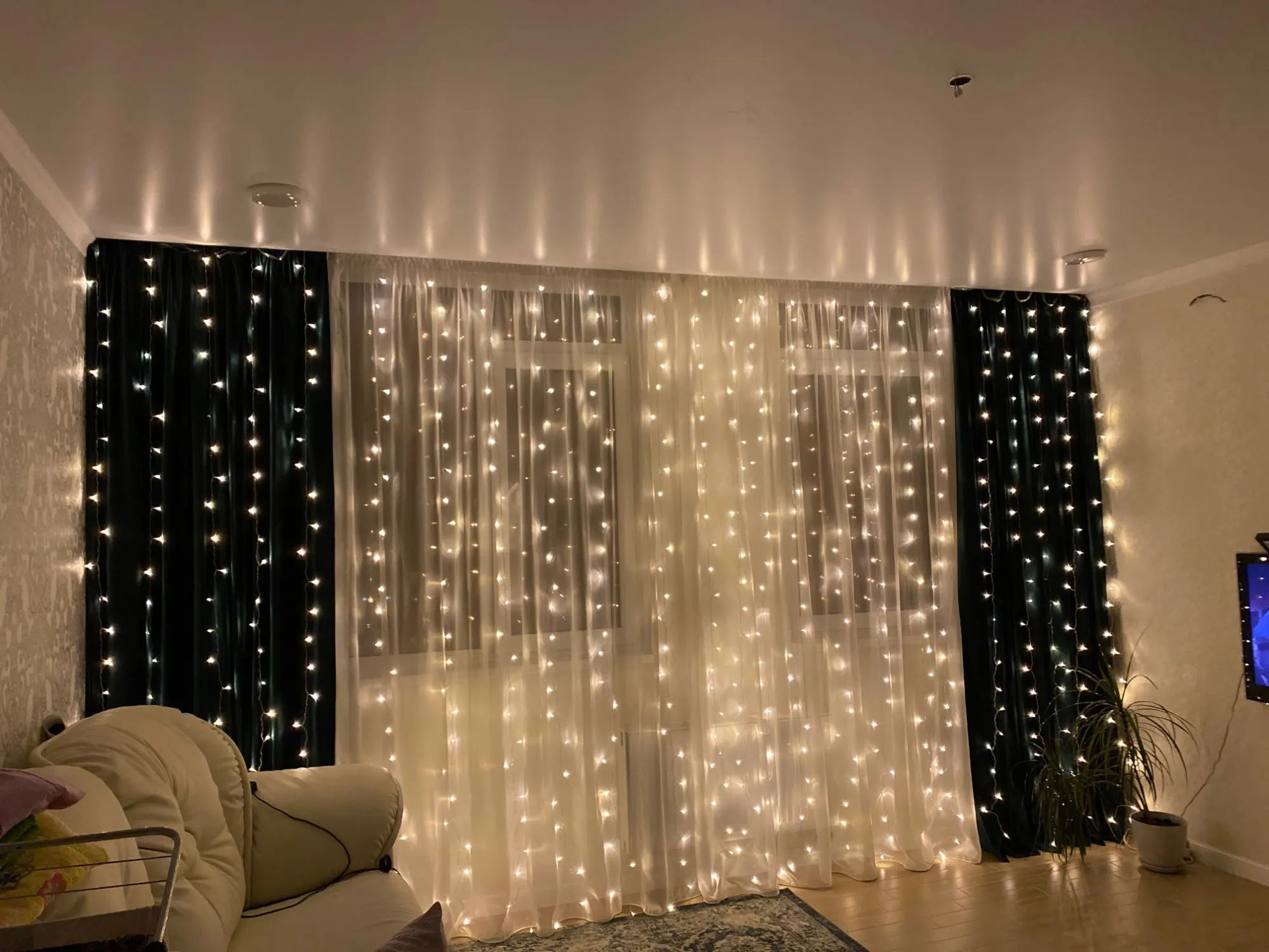 Высота стены 2,7 м, ширина - 4,7 м. Заказала 3×6. Переживала, что будет слишком большая, но гирлянда даже до пола не достаёт. Думаю, ещё вытянется, но всё равно 3 м на высоту потолка 2,7 - в самый раз. Короче не берите. А ширину можно было и 3м взять по размеру окна. Выглядит очень красиво, сразу праздничное настроение появляется. И не плохой такой дополнительный источник света.