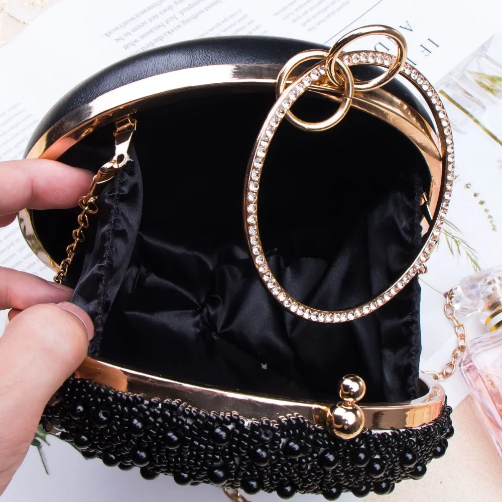 Роскошные женские вечерние круглые сумочки с бисером в винтажном стиле, черные, белые праздничные клатчи с золотой цепочкой