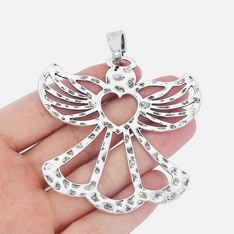 2 шт., антикварные Подвески серебряного цвета, большое открытое сердце, прекрасный ангел, кулон для ожерелья, ювелирные изделия, фурнитура 71x70mm