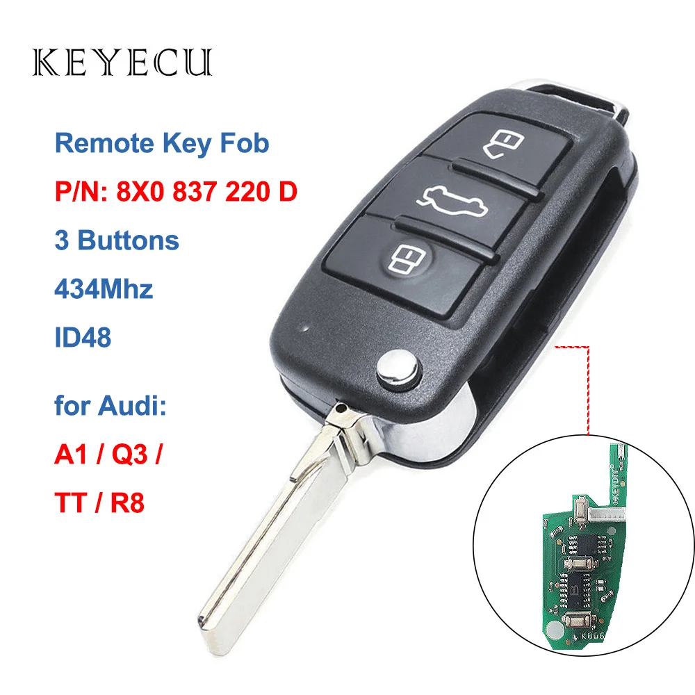 Keyecu Улучшенный ключ для автомобиля с дистанционным управлением 434 МГц ID48 Fob для Audi A1 TT R8 2009-2010 Q3 2011-2017 PN: 8X0 837 220 D, 8X0837220D