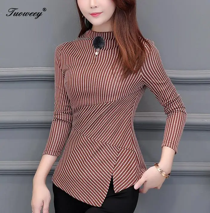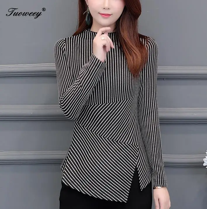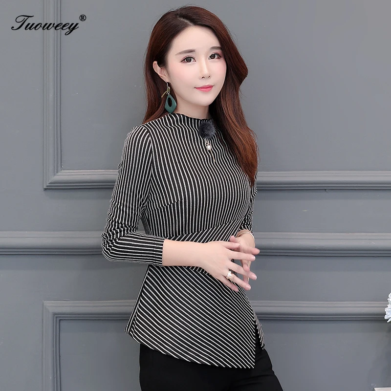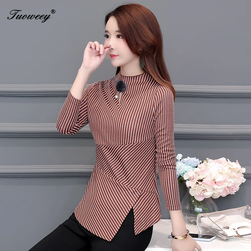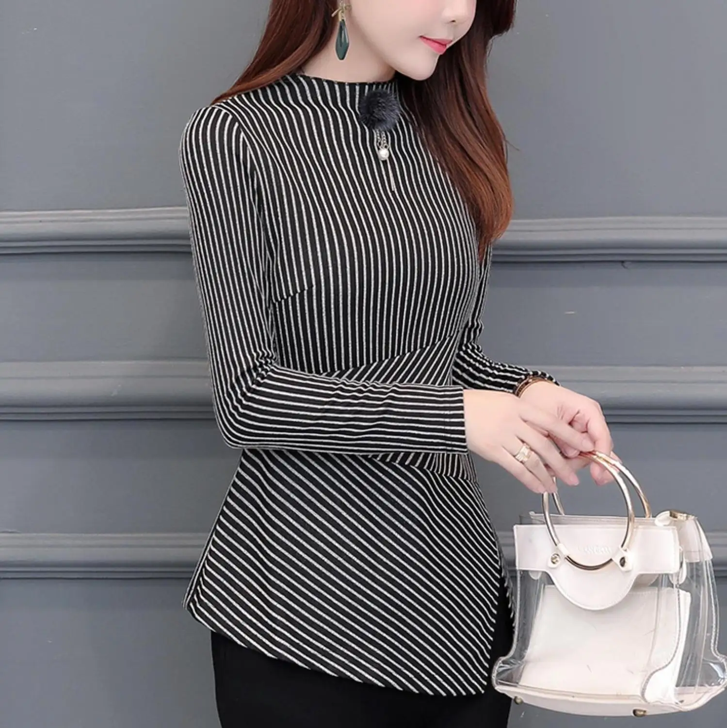 Женская рубашка в полоску, с воротником-стойкой, длинным рукавом, асимметричная, на пуговицах, приталенная, осень 2021, 4XL