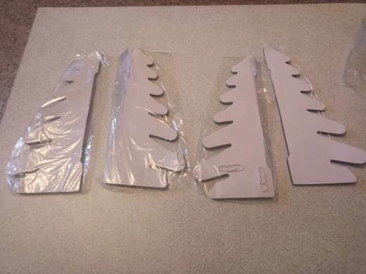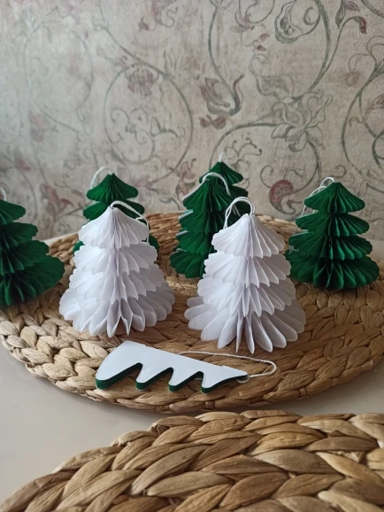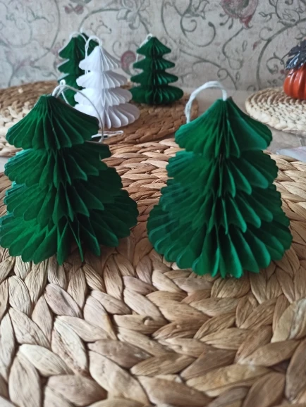 Ёлочки красивые,пришли быстро,срок доставки меньше месяца,вполне симпатичные,только вот темно-зеленые ничем не отличаются от светло-зеленых,заказывала 7,5 см,хочу ещё украсить блестками по краю.