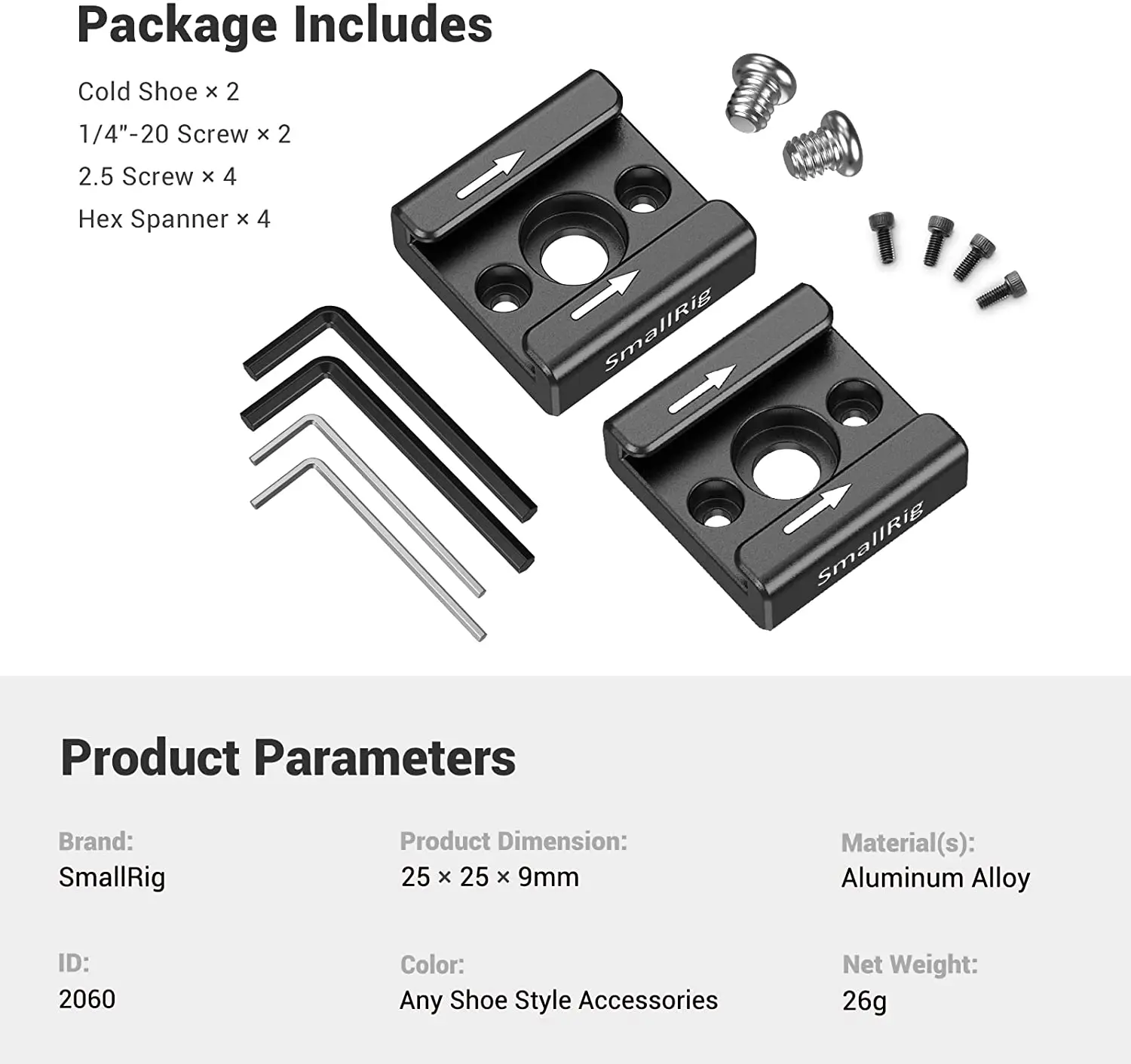 SmallRig Cold Shoe (2 шт. в упаковке) 2060 можно установить на любые аксессуары для камеры с резьбовыми отверстиями 1/4 "и M2.5, такими как клетка, блок холодной обуви и пластина и т. д. Потайное отверстие в центре прикрепляется к винту 1/4'', Но винт 1/4 ''не коснется контакта горячего башмака аксессуаров, установленных на холодной обуви. Поставляется с двумя надежными гибочными романами на одном конце для предотвращения случайного удаления. Стрелки на холодном башмаке показывают направление крепления дополнительных аксессуаров.
