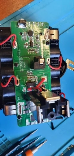 Напряжение холостого хода 19,5 В. При нажатии на кнопку индикатора заряда светятся индикаторы заряда. Инструмент от аккумулятора работает в штатном режиме. На счет емкости пока говорить рано. Нужно время на проверку емкости.