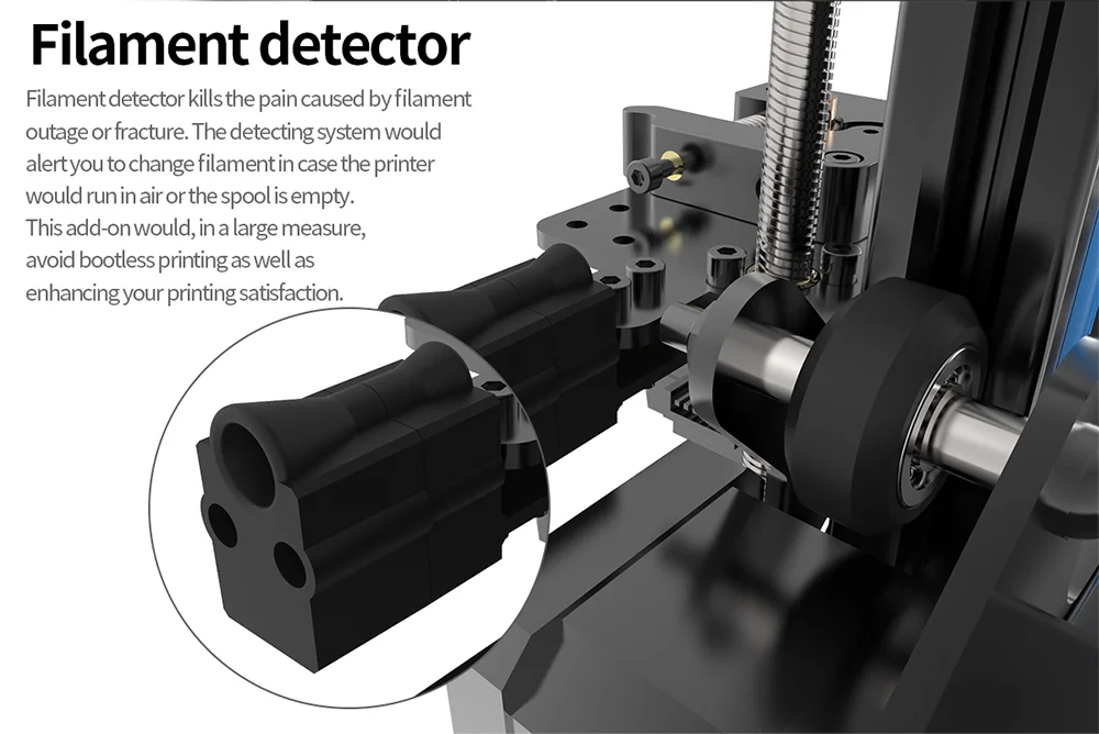 Его две другие ориентированные на пользователя функции являются детектором нити и возможностью прерывания. Первый обнаружит ненормальную ситуацию нити, такую как перелом нити и отключение, и подаст сигнал, чтобы напоминать вам о необходимости изменения печатного материала вовремя. Последняя, система восстановления, добавляется, чтобы сохранить статус печати в реальном времени и продолжить работу печати точно в том же месте, где она была остановлена. Это дополнение полностью избавляет от хлопот, связанных с повторяющимися и требующими много времени работами по печати, вызванными непредвиденным отключением электричества. Полностью избавьтесь от беспокойства о печати больших 3D моделей.