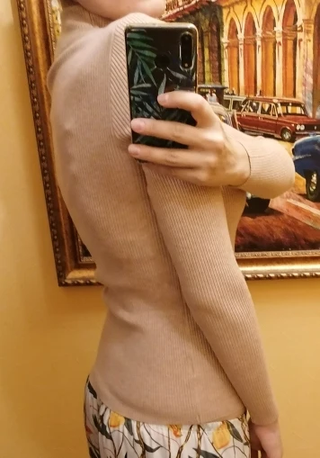 Заказ был отправлен быстро, на 2-й день. В Москву дошло за 2,5 недели, получила в 5post. На мои параметры 88-66-92, рост 170, размер S отлично подошёл, рукава достаточно длинные. 2 года назад покупала впервые в цвете Rice camel, она была толще и более хлопковой. Состав на ярлыке тот же, но ткань стала тоньше, более скользкой и синтетической. На фото со вспышкой видно как ткань новой водолазки (на фото слева) блестит больше, чем у старой (на фото справа, в катышках). Сшиты так же качественно, каждая обошлась в 530 руб. с купоном AliExpress. Сначала хотела вернуть, но оставила, потому что у нас такие в 2-3 раза дороже. Общаться с продавцом не было необходимости. В целом, рекомендую!