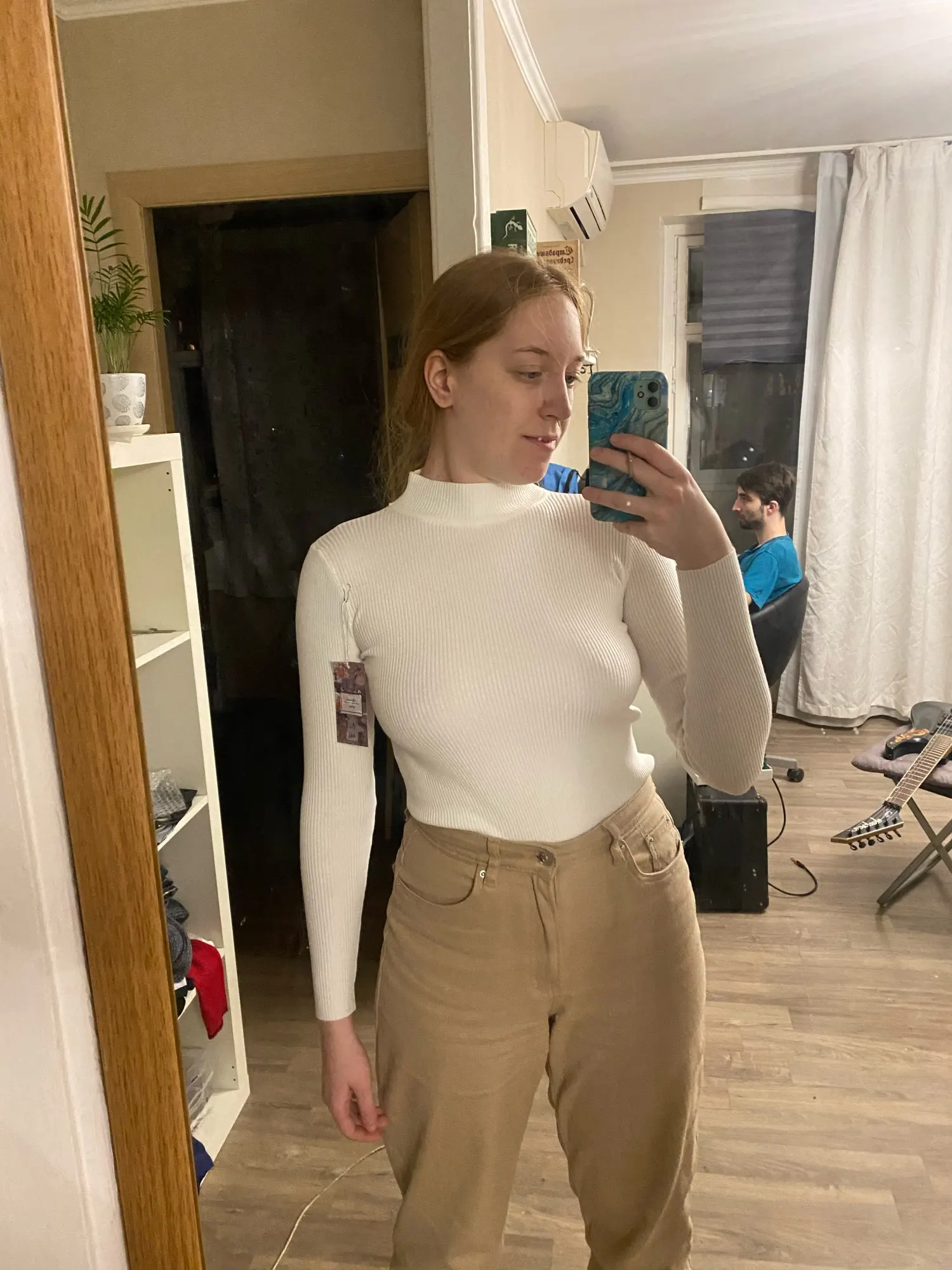 Классное качество, приятная к телу. Не белоснежная, цвет ivory / молочный. Рукава полной длины. Слегка просвечивает, на фото бледно-розовый топ под водолазкой.