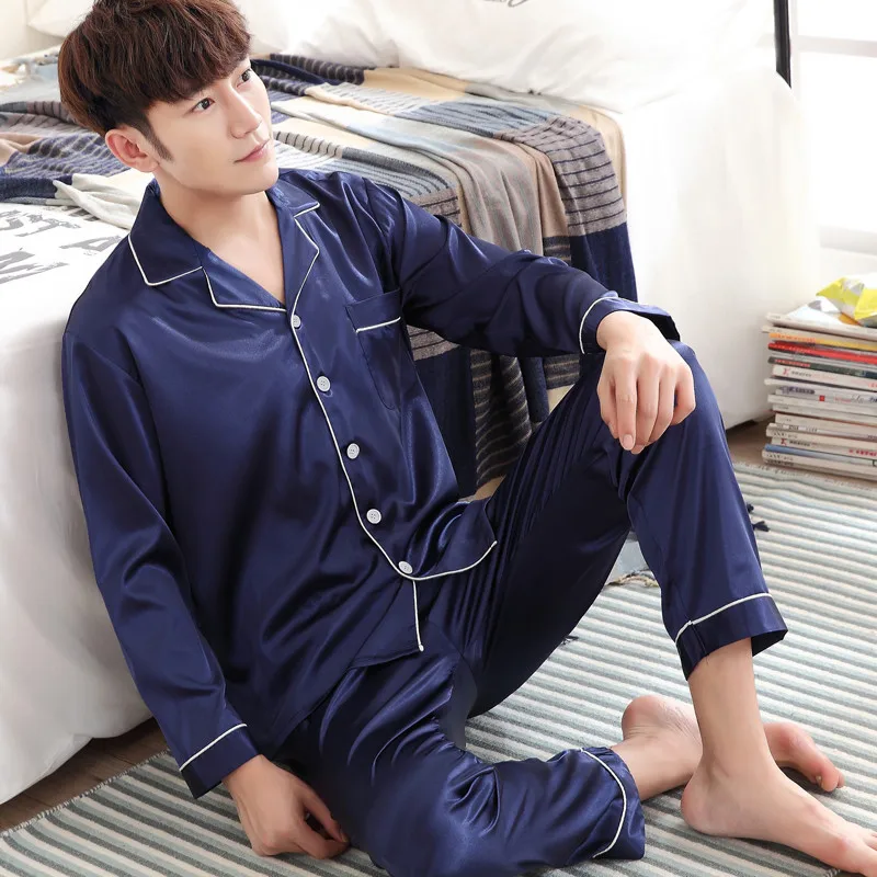 Пижама Мужская, черная, с длинным рукавом, весна-осень, шелковая ночная рубашка, L-XXXL