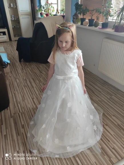 Bardzo ładna sukienka. Wykonana bardzo starannie. Nie sądziłam, że za taką cenę uda się kupić taką ładną sukienkę. Na komunię idealna. Rozmiar ok. Szczupła dziewczynka, 140 cm wzrostu- 12 T pasuje. Szybka wysyłka. Polecam.