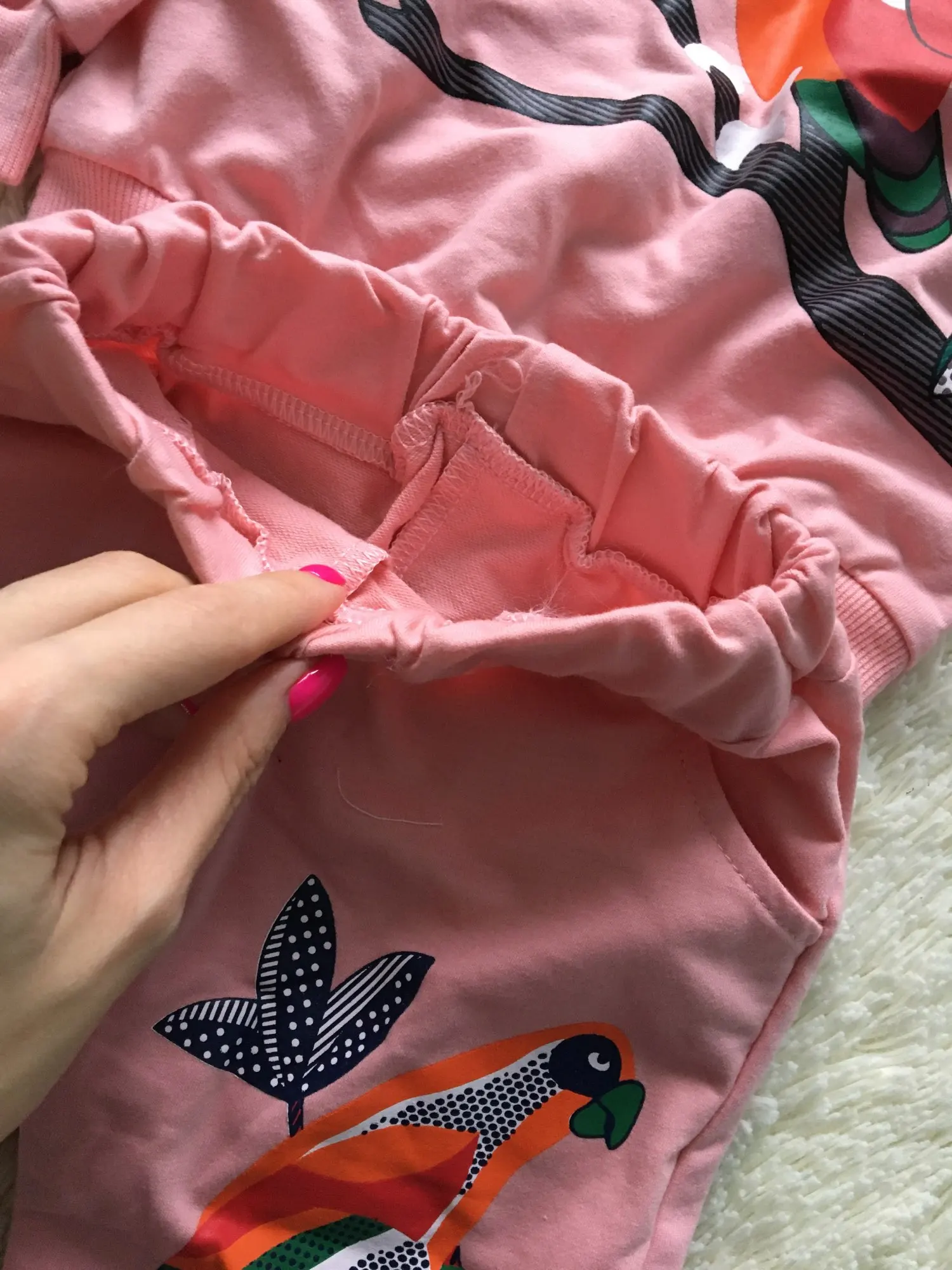 Костюм хороший, нитки нигде не торчат, принт нанесён качественно. После стирки не полинял, рисунок не облез. Вообщем рекомендую. Доставка примерно 3 недели до Москвы.
