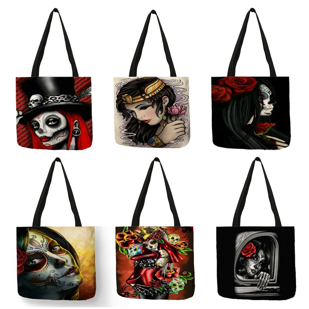 Модные женские сумки для покупок 2021, женская сумка-тоут из эко-льна с рисунком черепа, тату, повседневная школьная сумка