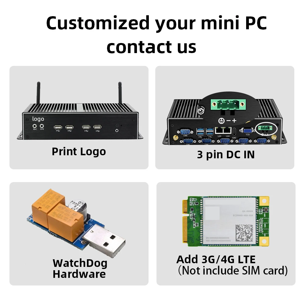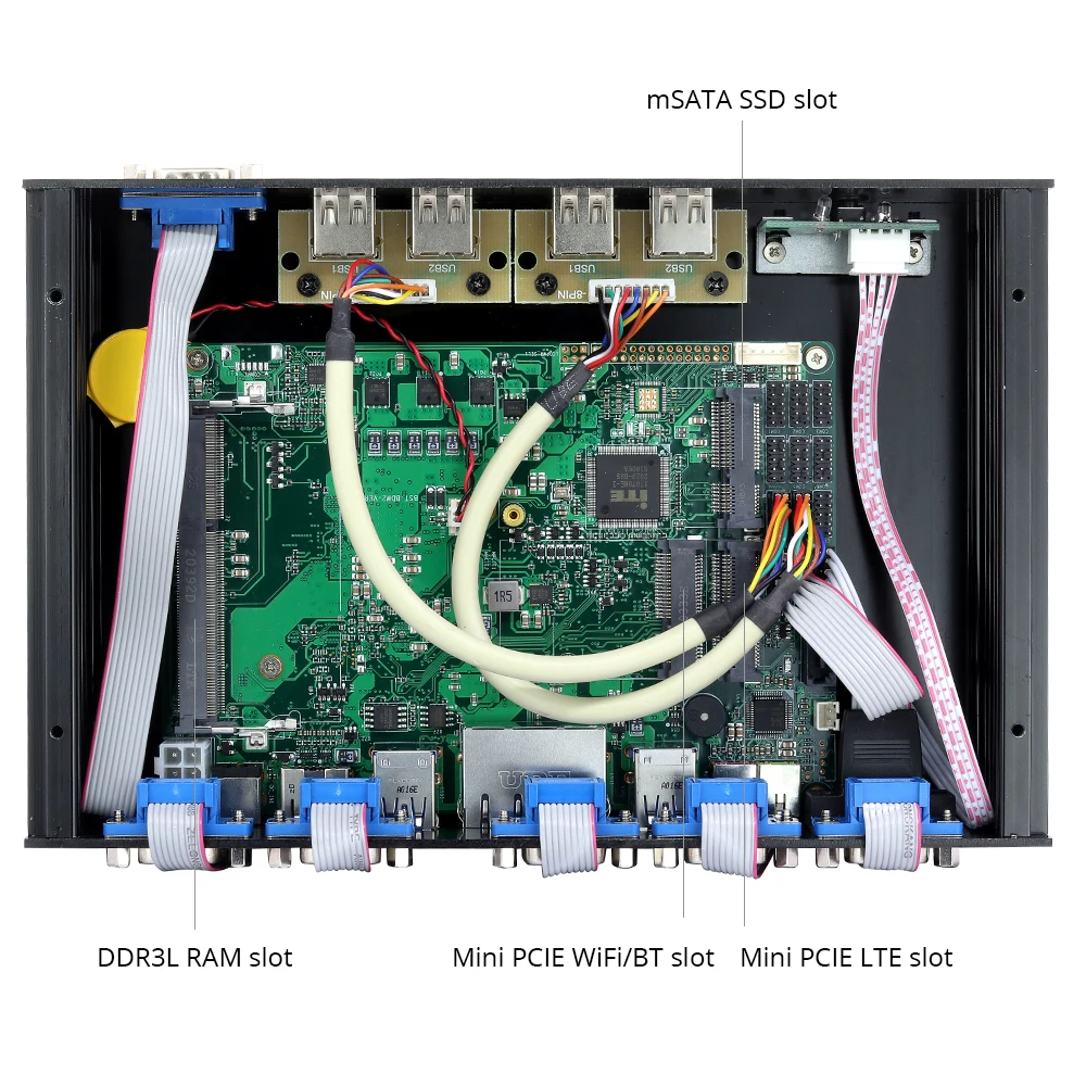 - Support Windows 10, Windows 8 & 8.1, Windows 7, Linux & Ubuntu, VxWokrs, WES7, WES8; - Support 1x SODIMM DDR3L 1.35V RAM and dual storage 1x mSATA and 1x 2.5inch SATA SSD/HDD. - Total 8x USB prots 4x USB 3.0, 4x USB 2.0 , - Dual NIC, 2x RJ45 10/100/1000Mb/s Intel i211AT Gigabit Ethernet - COM1 COM2 are RS232/RS422/RS485 Serial Ports, BIOS setting serial port definition ; COM3 to COM6 are RS232 serial ports; - HDMI & VGA support independent video output - Aluminum Chassis & Fanless passive Cooling - Support watchdog, virtualization, wake up on LAN, automatically power on when power restored after a sudden power loss; - Support expansion GPIO/ WiFi/ 3G/4G LTE, GPS module, dongle.