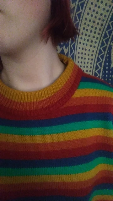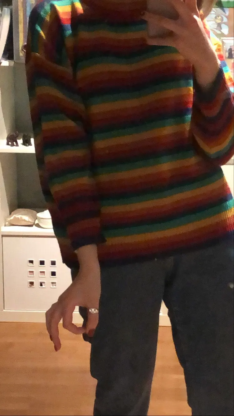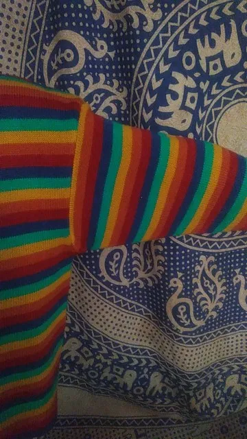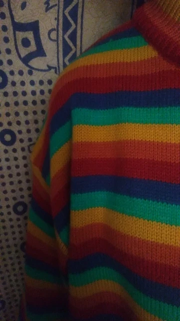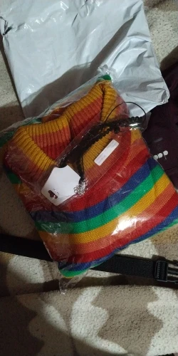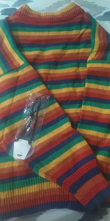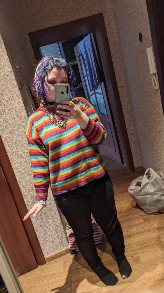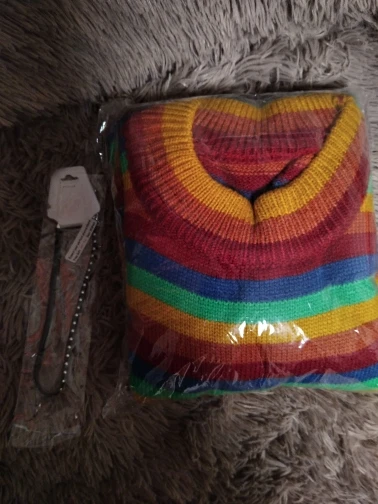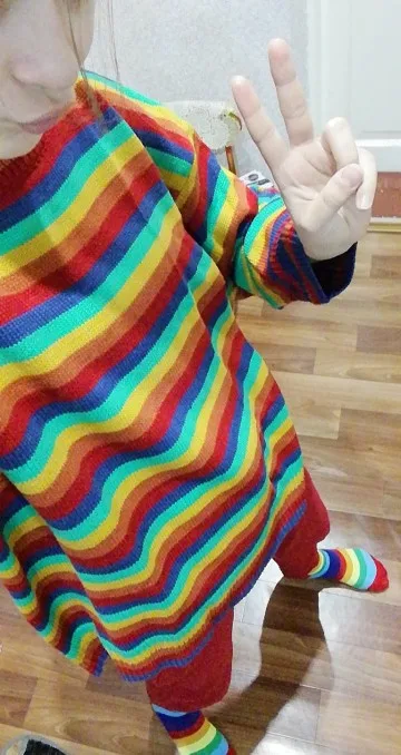 Свитер очень яркий, насыщенный, но надо учитывать русские размеры, немного хотелось бы подлиннее рукав. Было вложено два маленьких подарочка :/