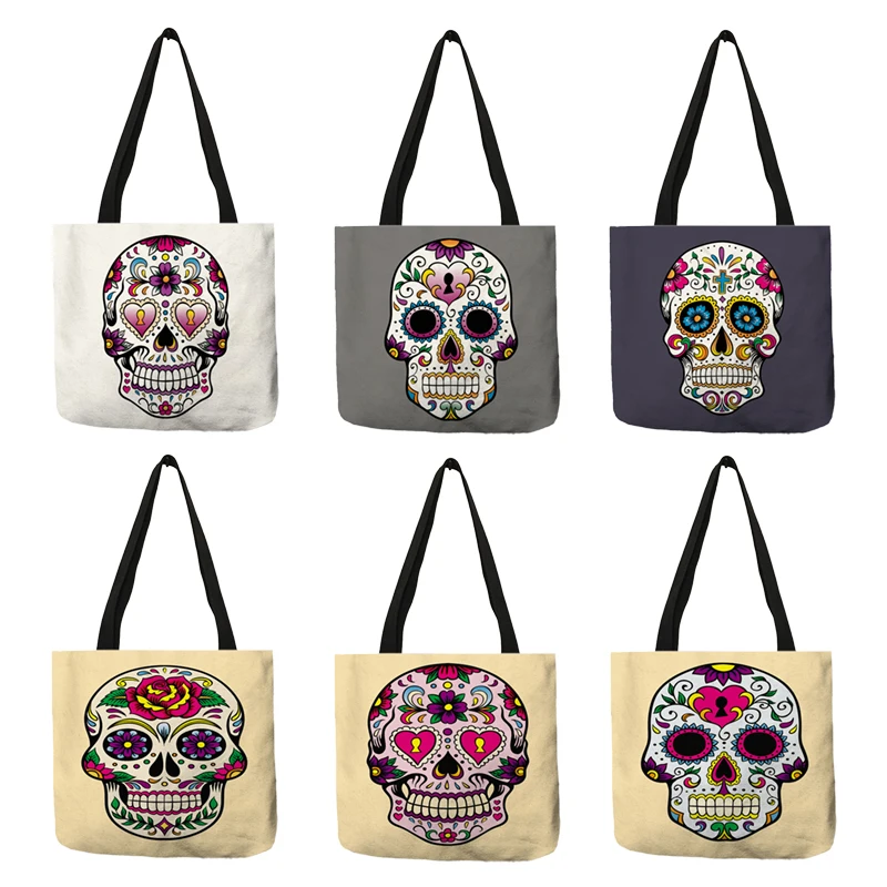 Уникальная женская сумка-тоут с цветочным принтом черепа, экологически чистые льняные многоразовые сумки для покупок, повседневные сумки через плечо